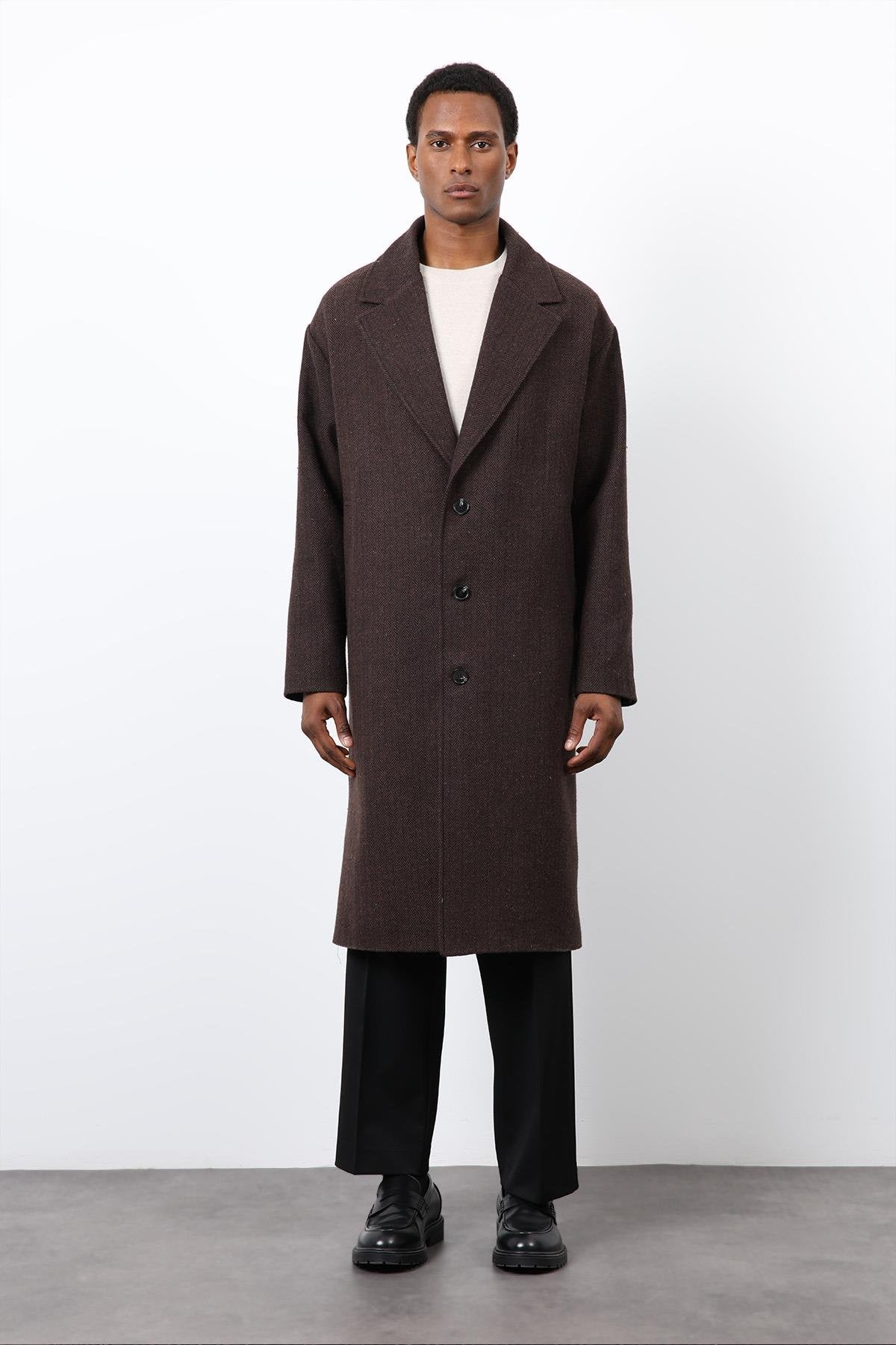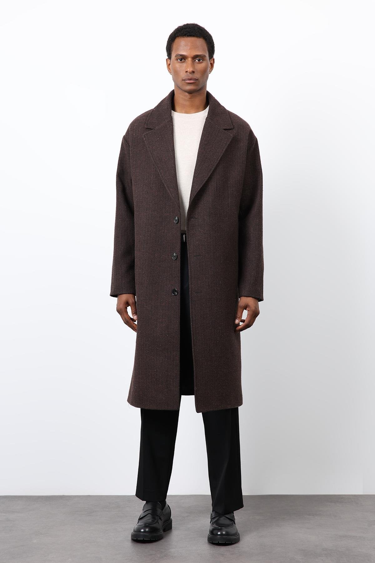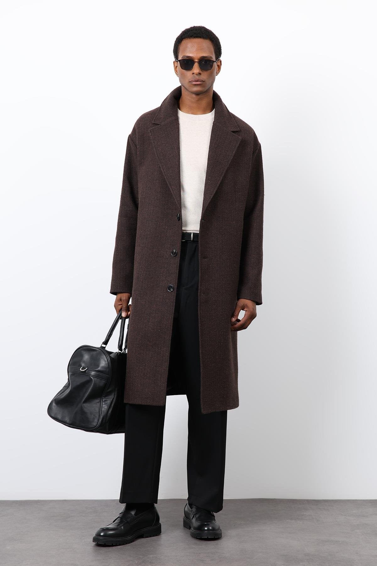 Kahve Relax Fit Balıksırtı Desenli Erkek Kaban