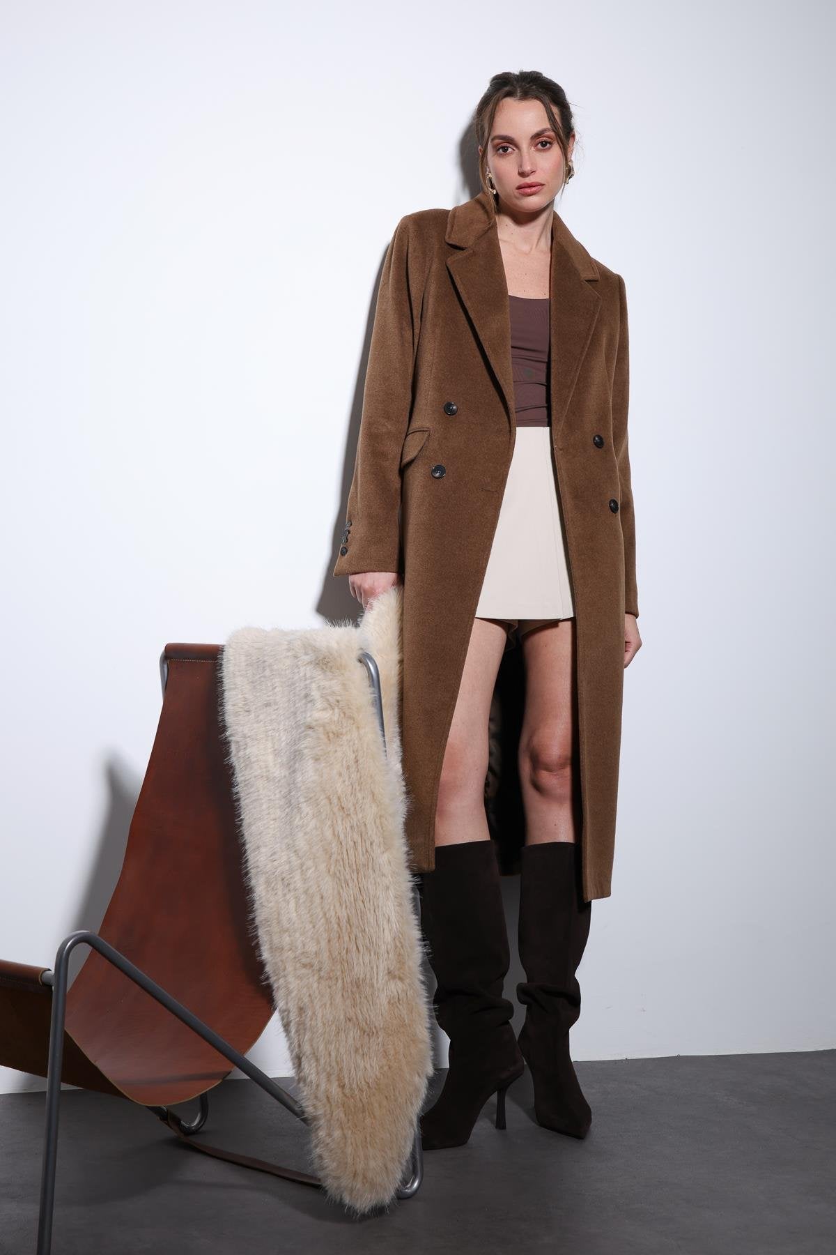 Kahve renkte, yün karışımlı kumaştan üretilmiş kruvaze kapamalı uzun kadın kaban modelidir. Modern ve sade siluetiyle hem klasik hem de günlük kombinlerde kullanılabilir. Soğuk havalarda sıcak tutan dokusuyla sonbahar ve kış sezonunda konfor sağlar. Türkiye’de üretilmiştir.