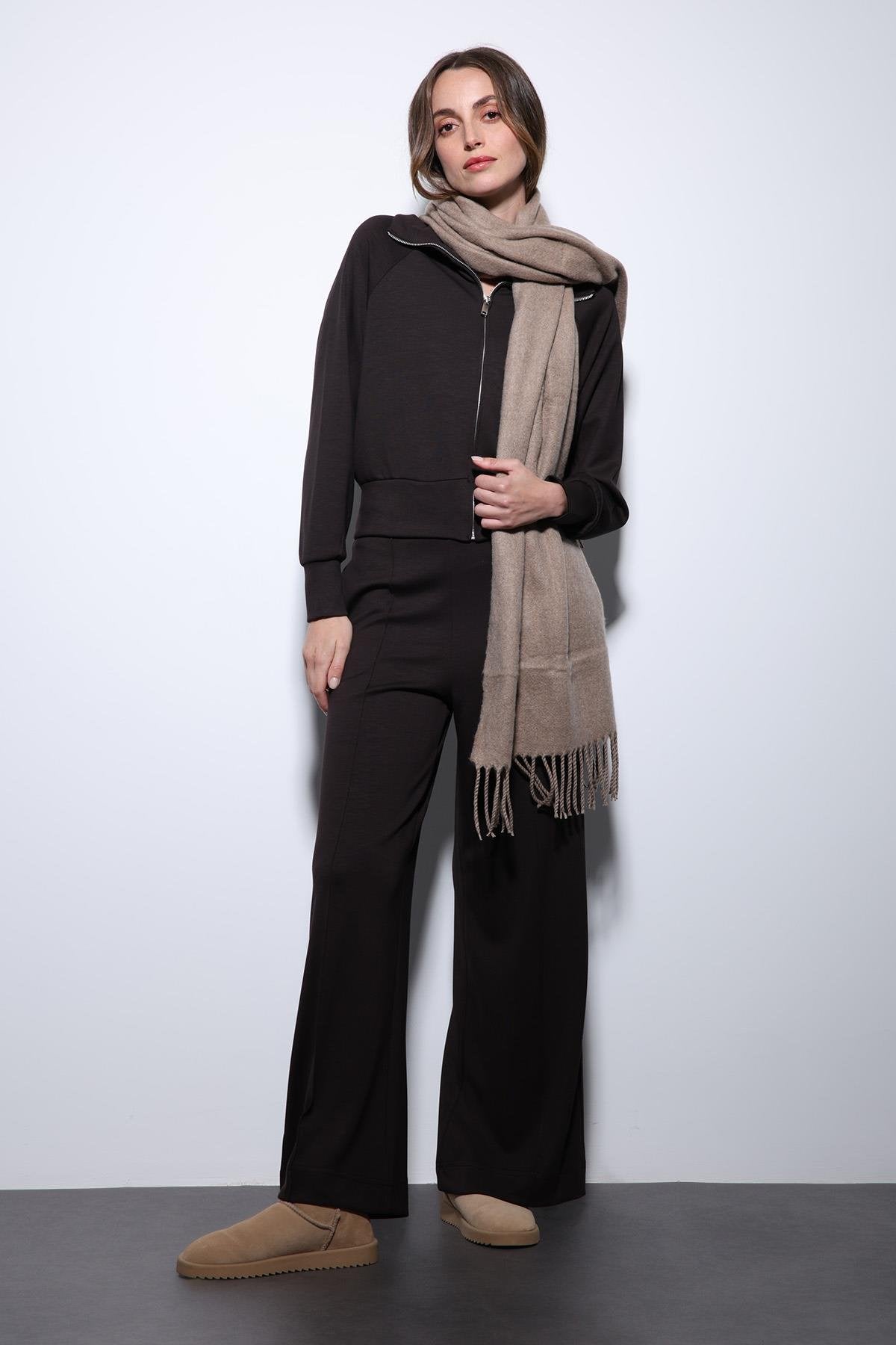 Koyu kahve renkte, fermuarlı üst parçası ve rahat kesimli altıyla günlük kullanıma uygun kadın eşofman takımıdır. Yumuşak dokusu sayesinde gün boyu konfor sunar. Hem spor hem de şehir stiline uyum sağlayan modern bir tasarımdır. Türkiye’de üretilmiştir.
