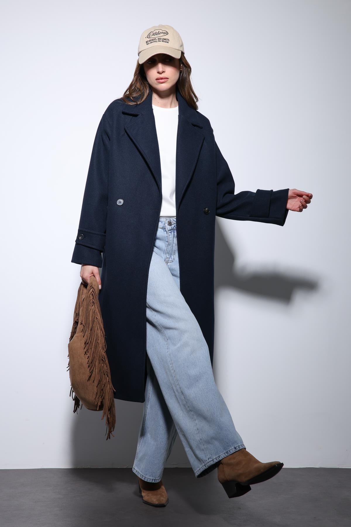 Lacivert Kadın Yumuşak Dokulu Oversize Kruvaze Kaban
