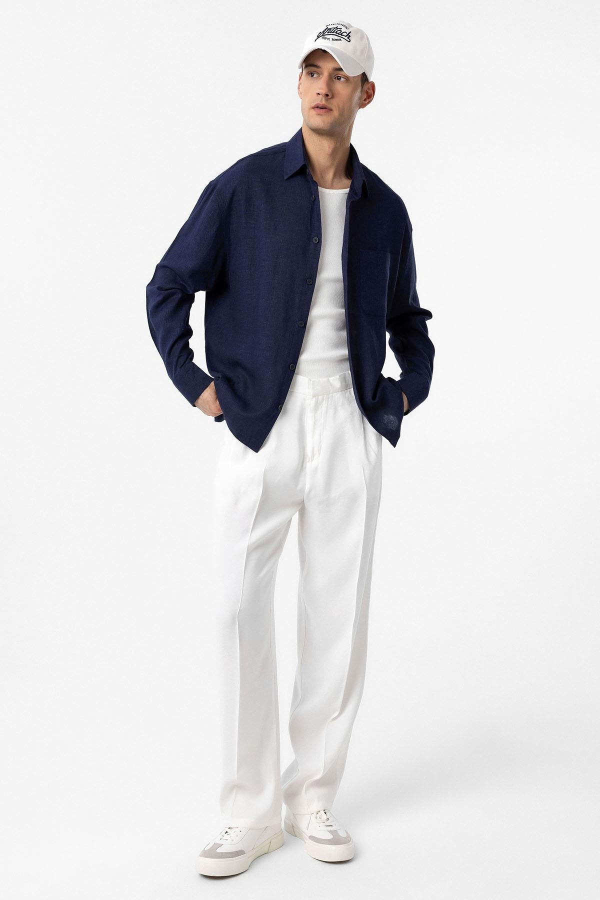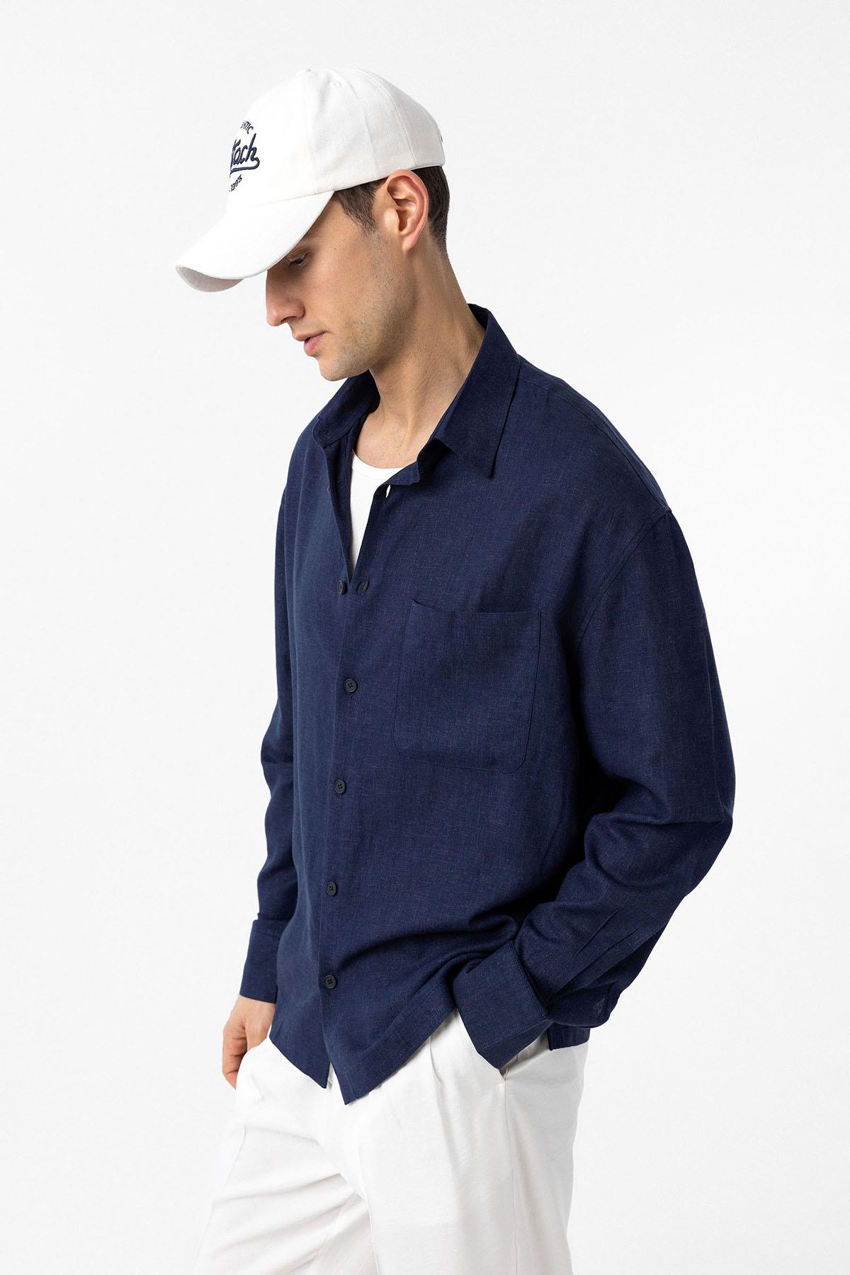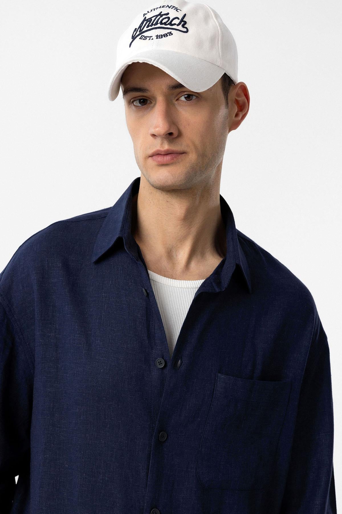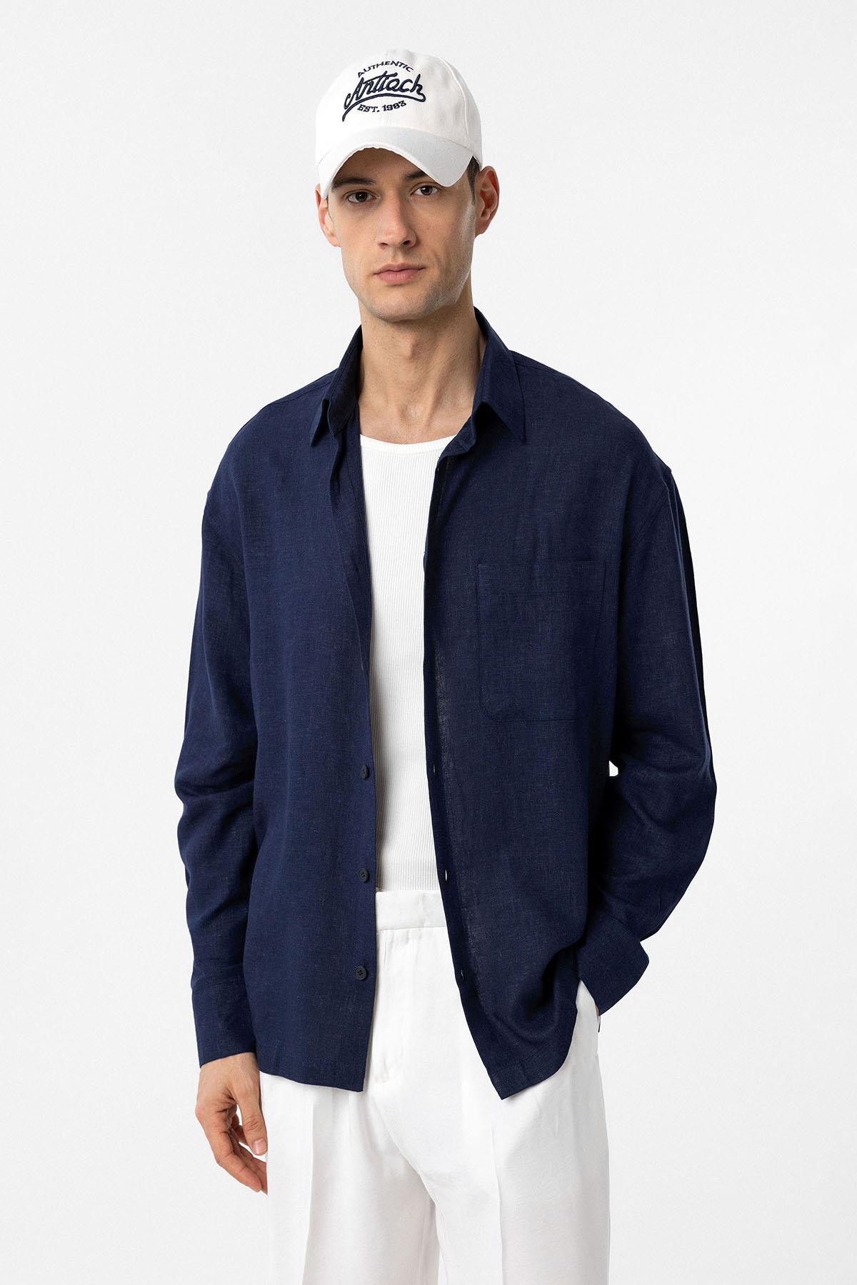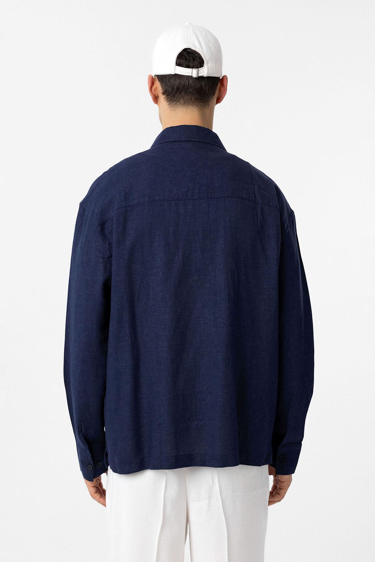 Lacivert Keten Karışımlı Relax Fit Erkek Gömlek