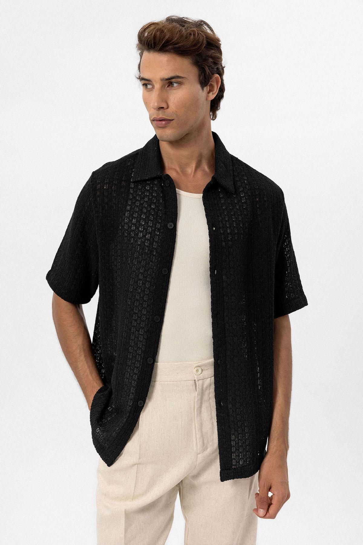Siyah hakimiyetinde özgün duruşuyla öne çıkan Antioch Kısa Kol Gömlekkarakteristik silüet yansıtan lüks tasarımıyla göz dolduruyor.Kısa Kol tasarım Tam Pat Düğmeli kapamasıyla tamamlanıyor. Lüks dokusu ve kalıbıyla son derece konforlu hissetmenizi sağlayacak tasarım günlük şehir stillerinizde ve ofis takımlamalarınızda kullanıma uyum sağlıyor. İsteğinize göre çeşitli pantolonlarınızla beraber kullanabileceğiniz tasarım şık ve iddialı görünüm kazanmanızı sağlıyor ve stilinizi bir adım öne taşıyor.