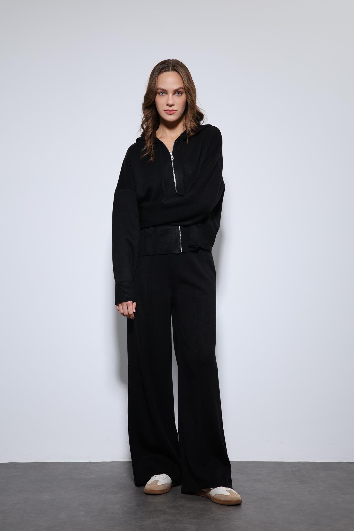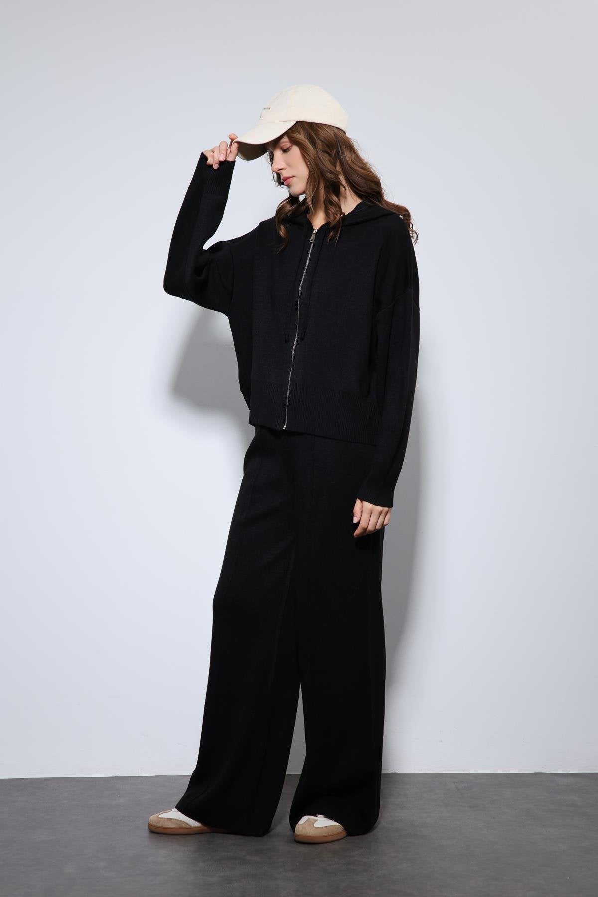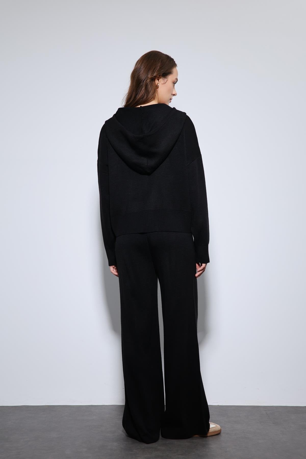 Siyah Kapüşonlu Üst ve Geniş Paça Triko Takım