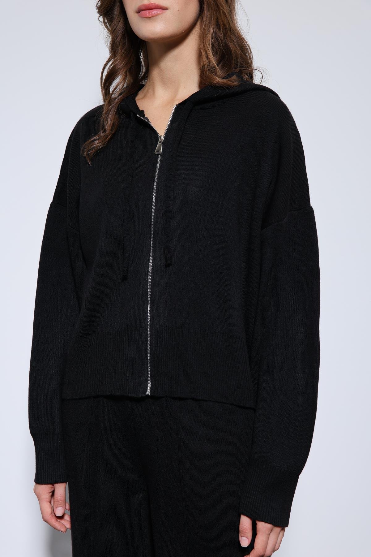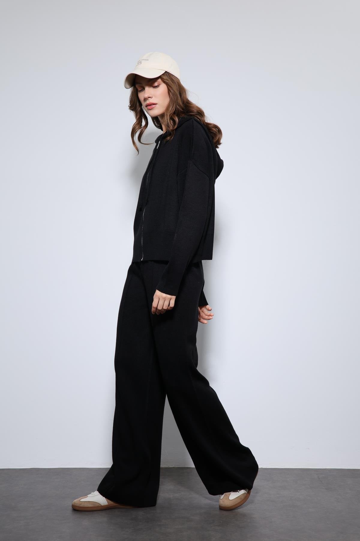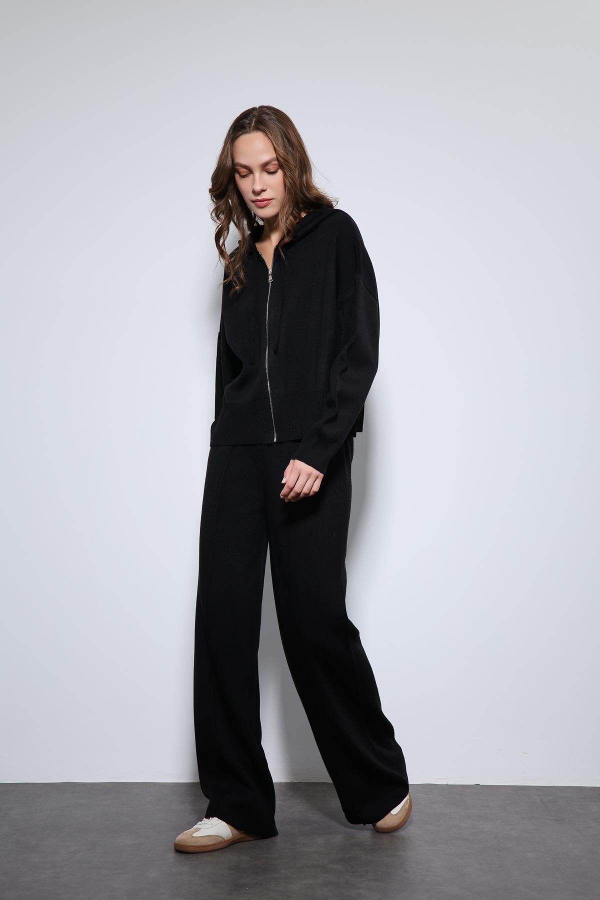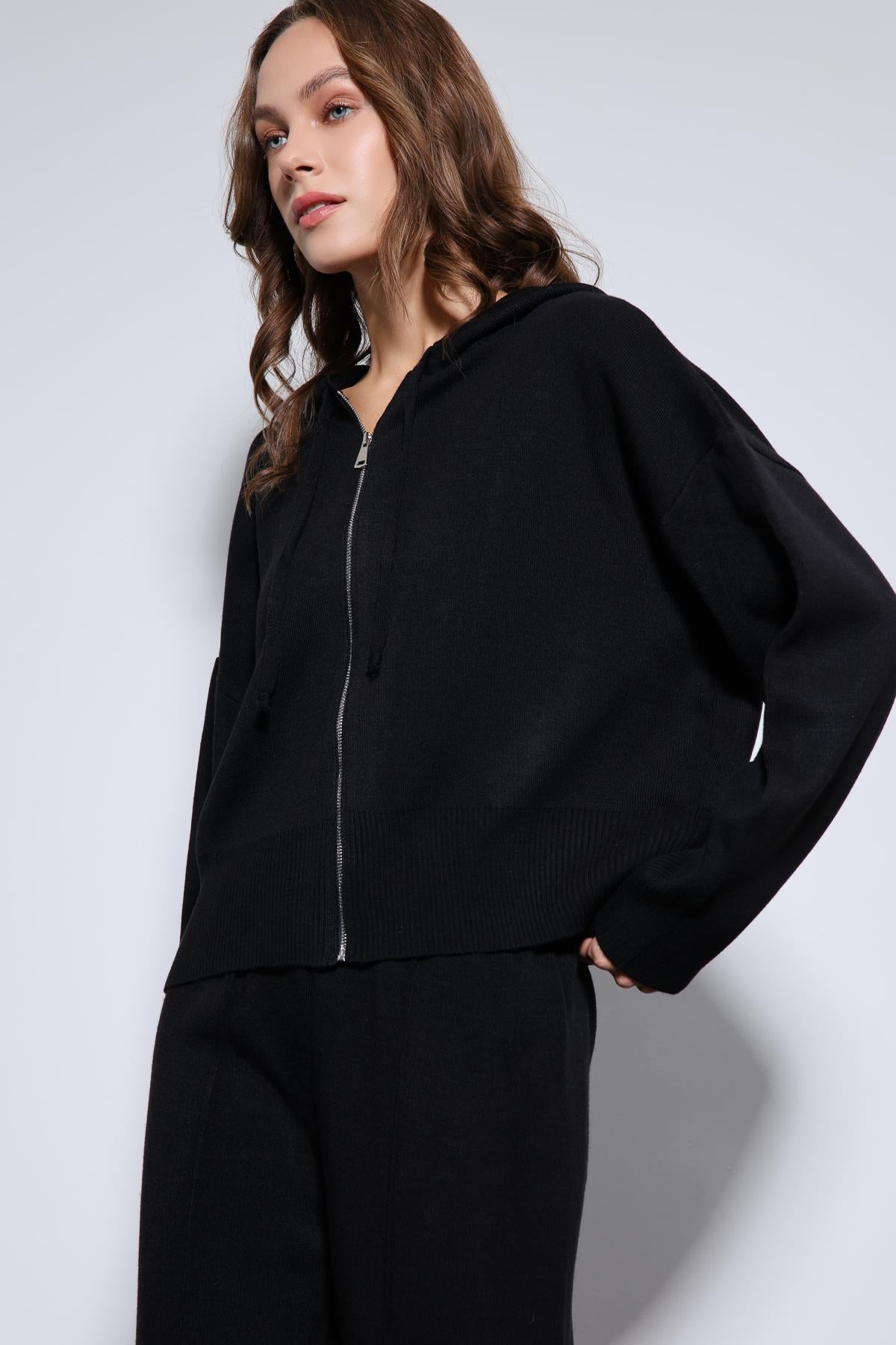 Siyah Kapüşonlu Üst ve Geniş Paça Triko Takım