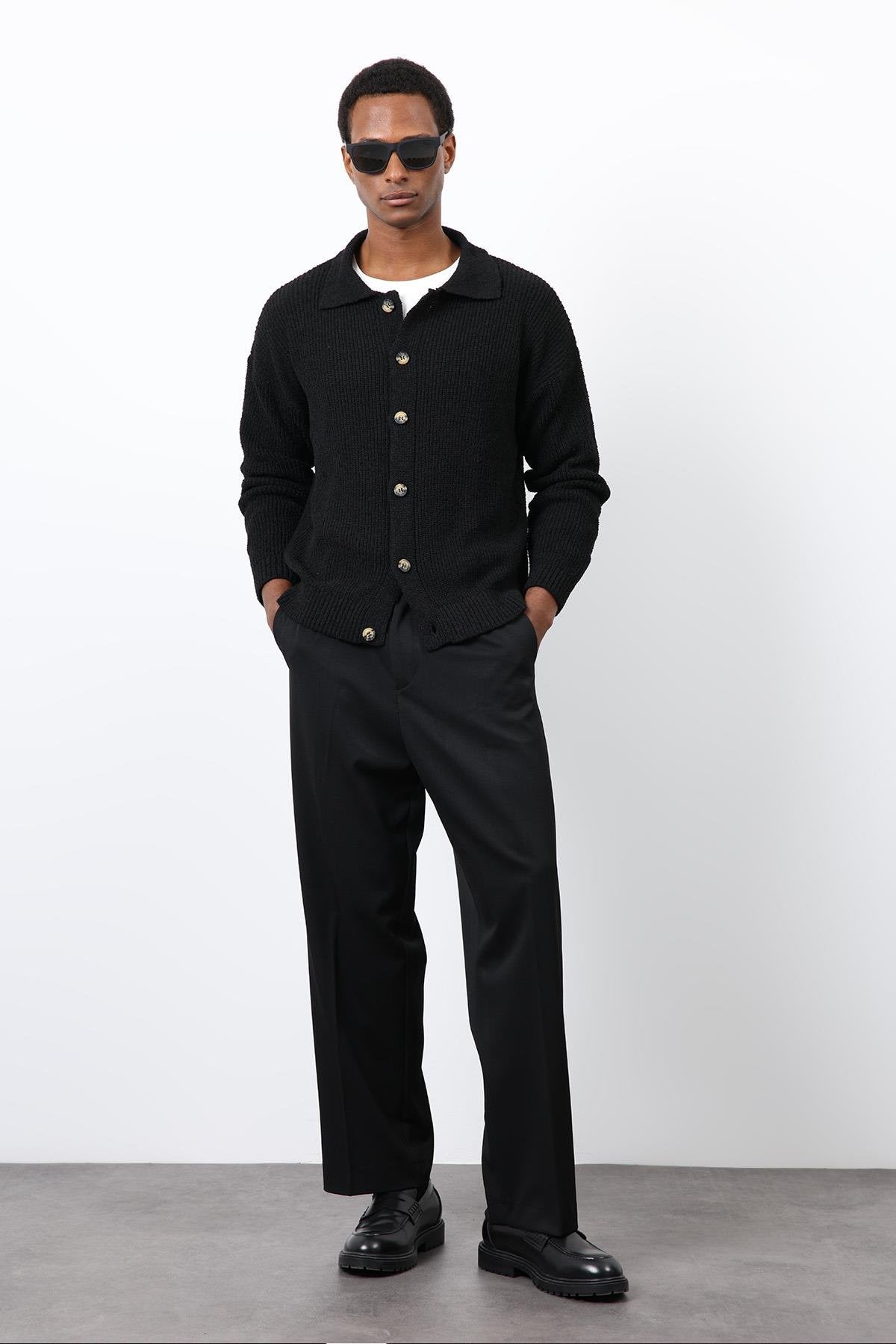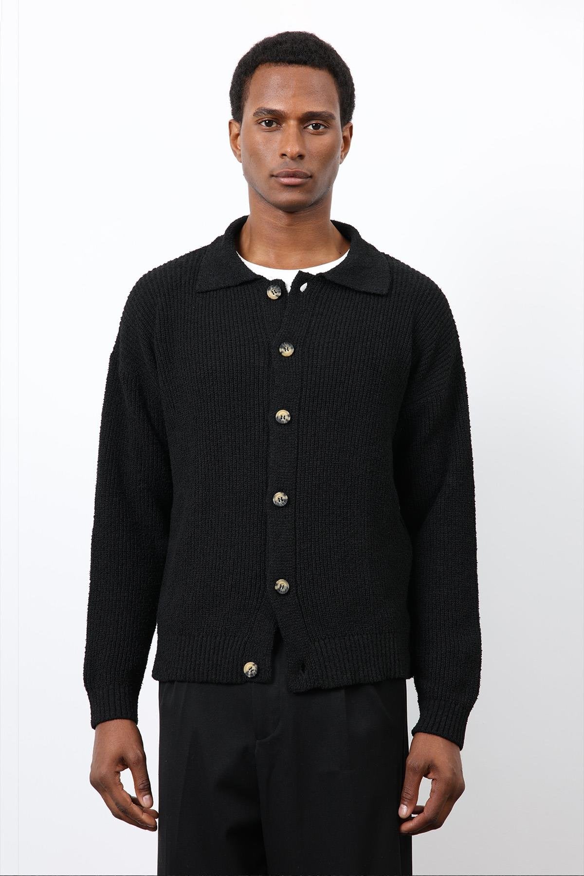 Modern şehir stilini rahatlıkla buluşturan Antioch Siyah Örme Triko Erkek Hırka, buklet dokulu örme kumaşı ve relax fit kalıbıyla gün boyu konfor sunar. Polo yaka formu ve düğmeli kapama detayı sayesinde hem casual hem de smart-casual kombinlere kolayca uyum sağlar. Kalın yapısı ile serin havalarda sıcak tutarken, zamansız siyah rengiyle gardırobun kurtarıcı parçalarından biri olur.