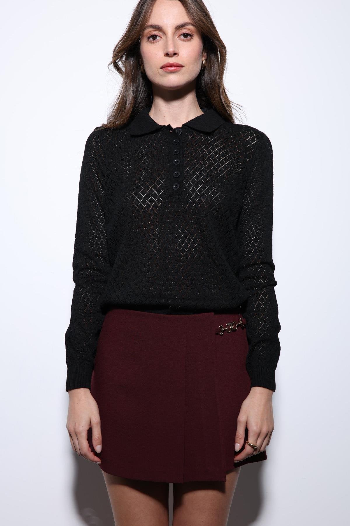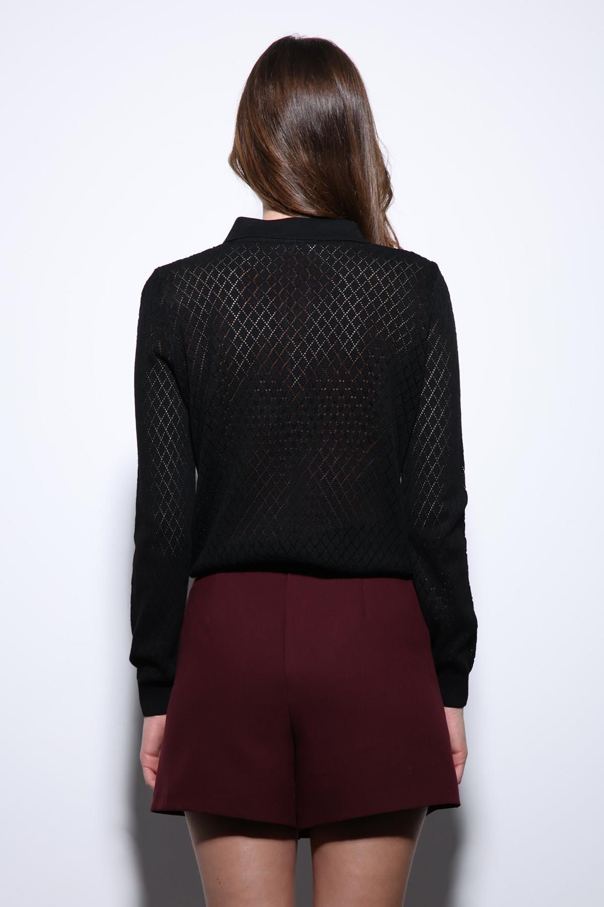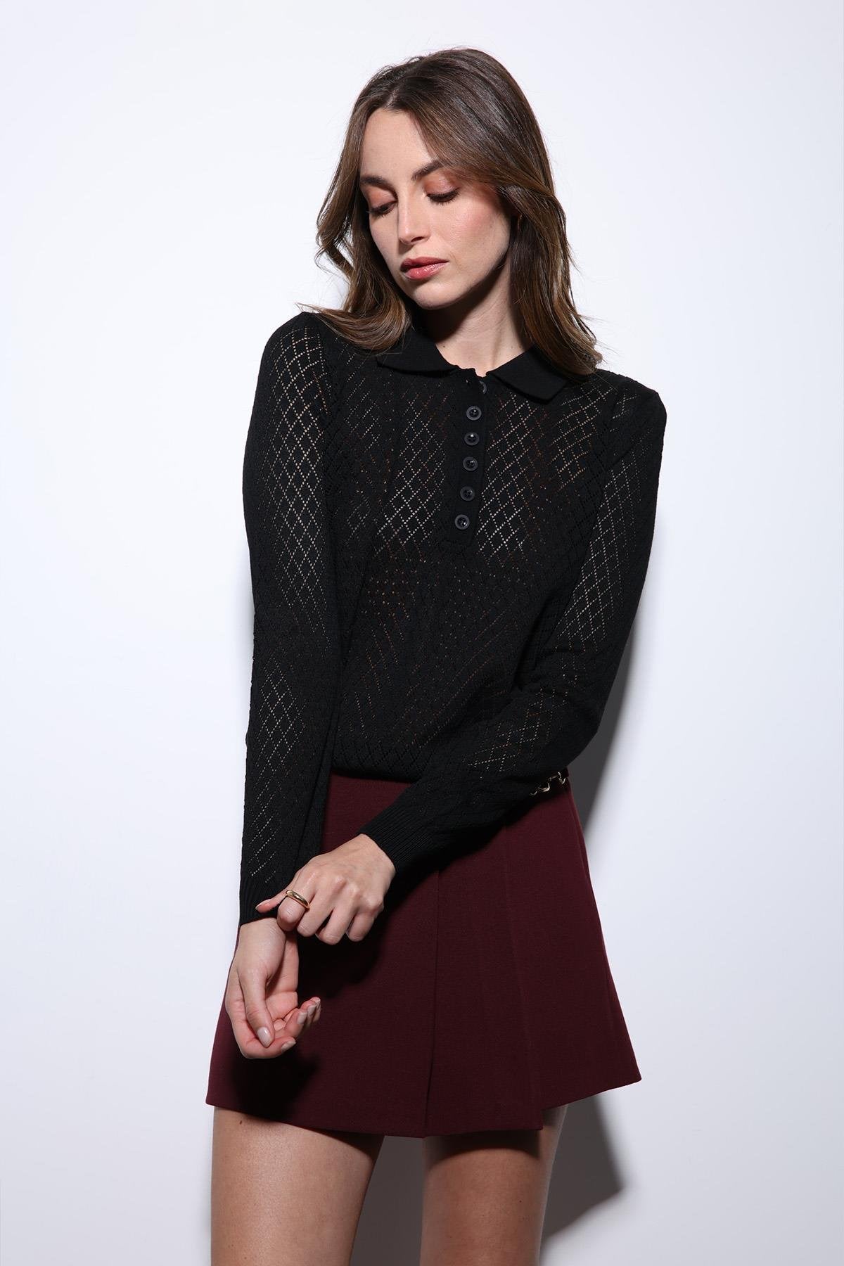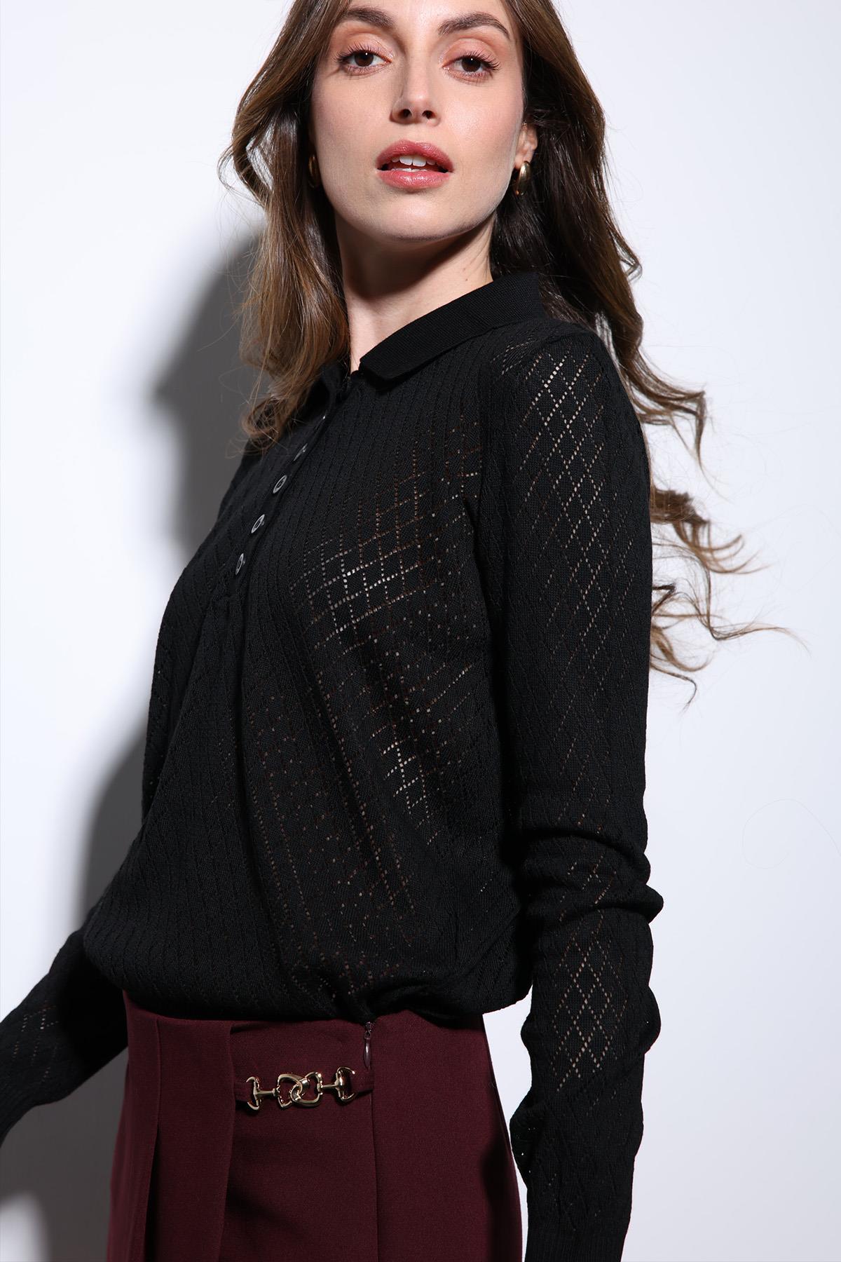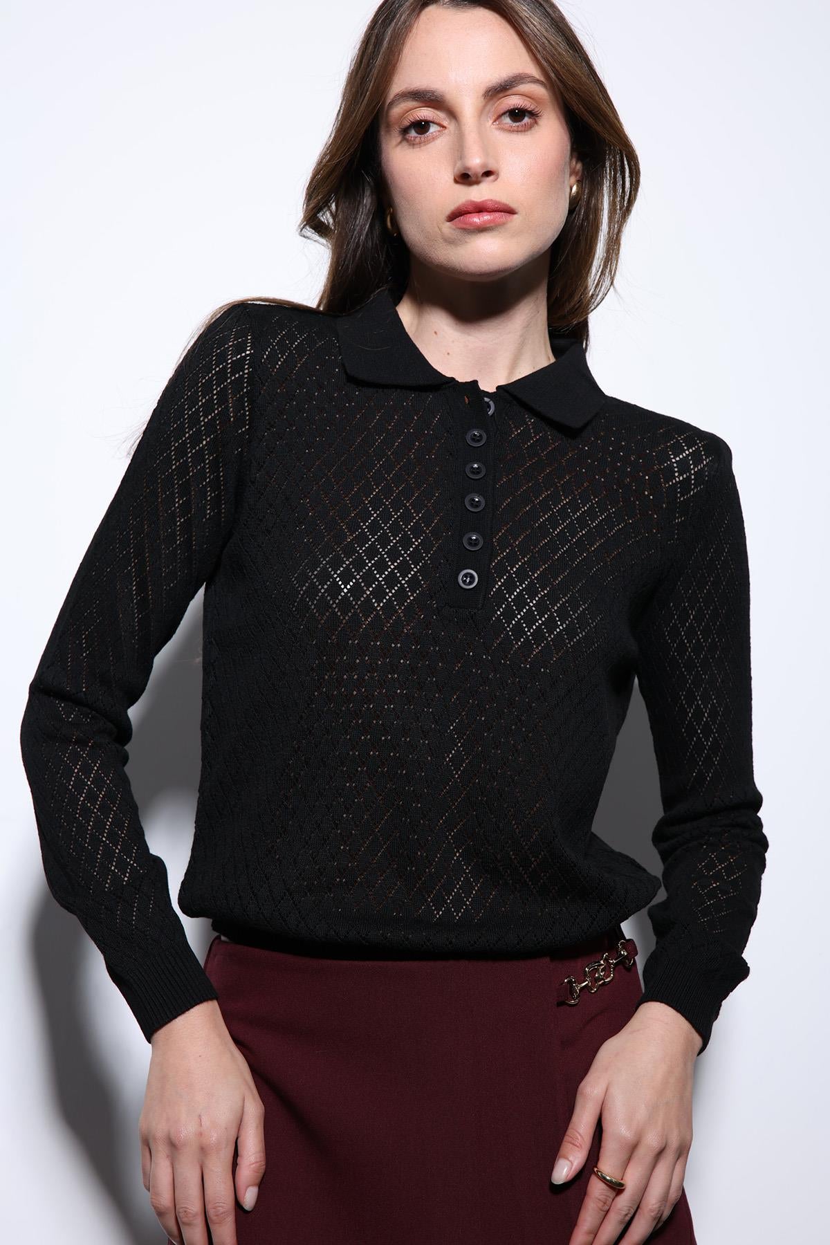 Siyah Polo Yaka Desenli Triko Kadın Kazak