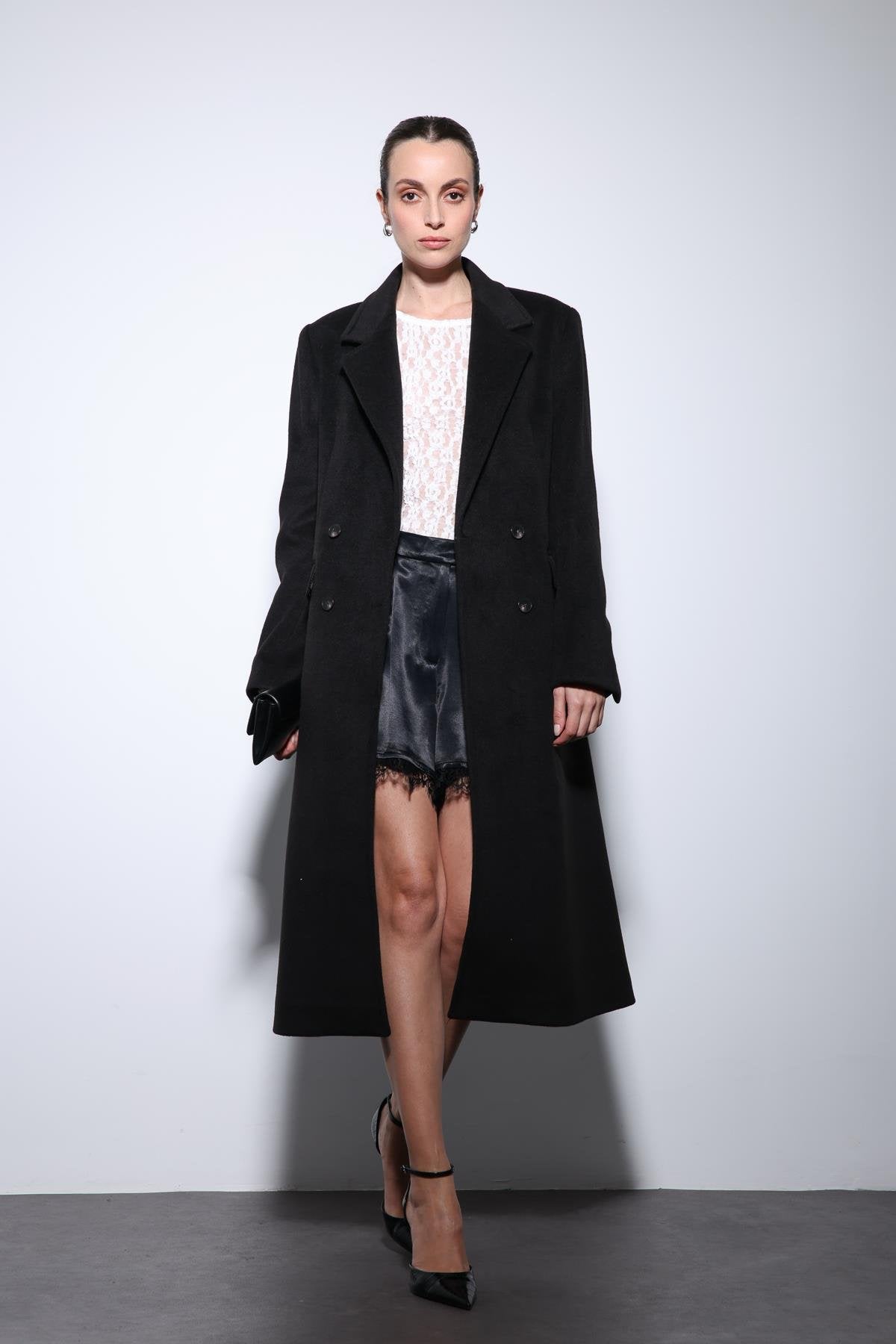 Siyah renkte, yün karışımlı kumaştan üretilmiş kruvaze kapamalı uzun kadın kaban modelidir. Sade ve modern kesimiyle hem klasik hem de günlük kombinlerde kullanılabilir. Soğuk havalarda sıcak tutan dokusuyla sonbahar ve kış sezonunda konforlu bir kullanım sunar. Türkiye’de üretilmiştir.