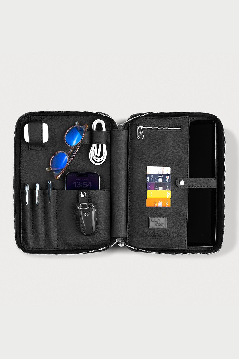 İç Yerleşim: Şarj cihazı bölmesi, çok amaçlı deri slotu, çıtçıtlı anahtarlık bölmesi, ajanda not defteri (25 cm x 15 cm), Airpods bölmesi, 3 adet kalemlik bölümü, 2 adet USB kablo bölümü