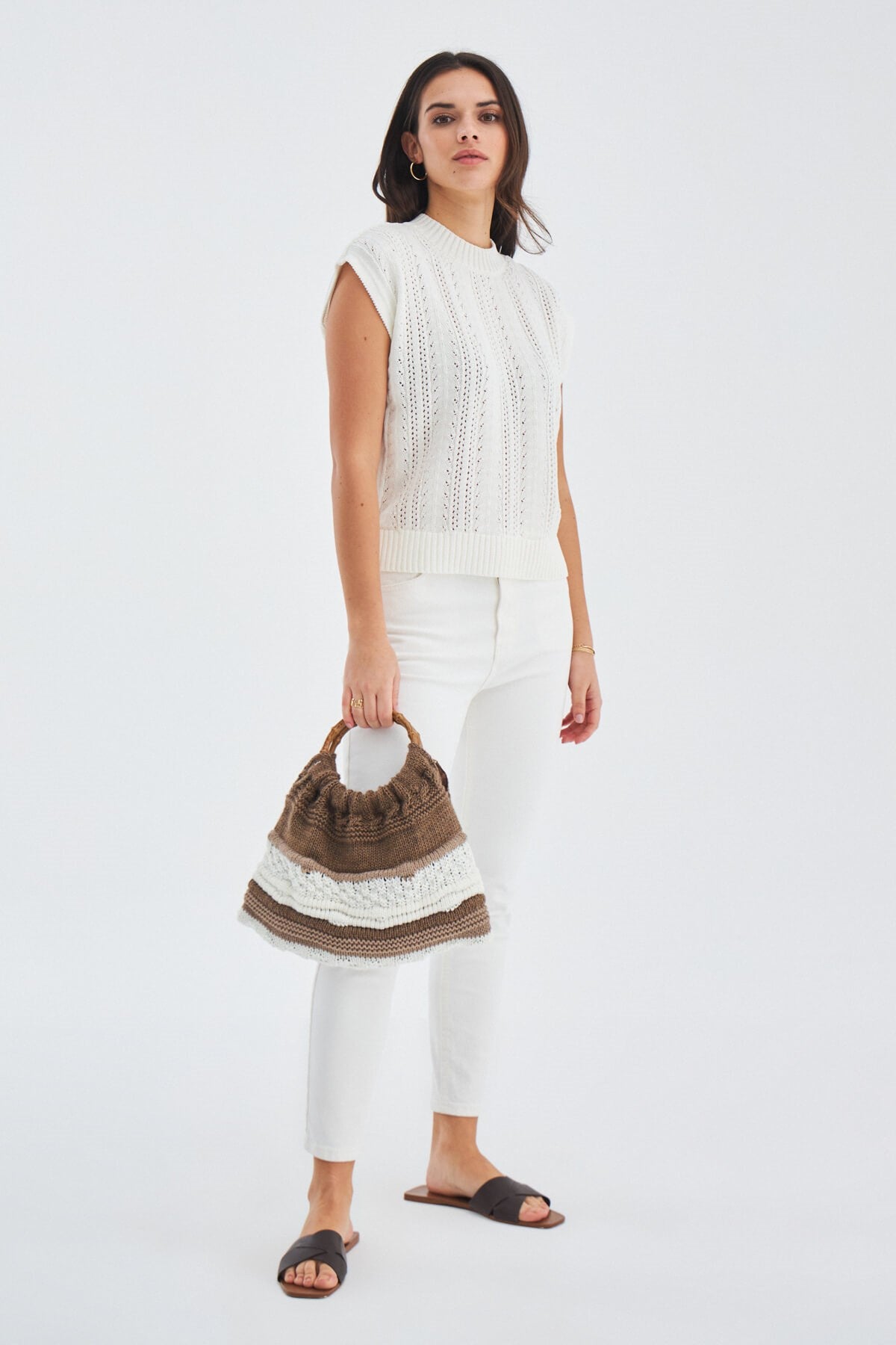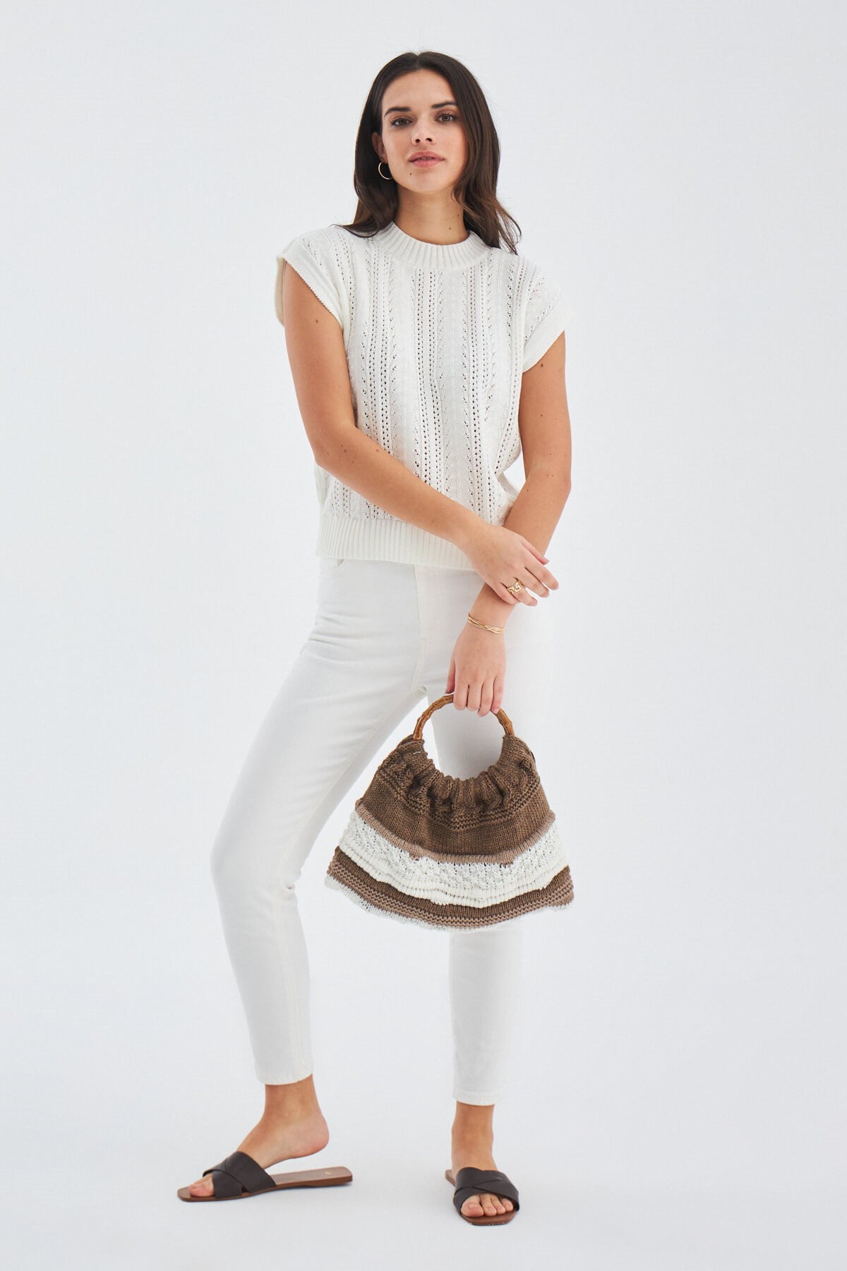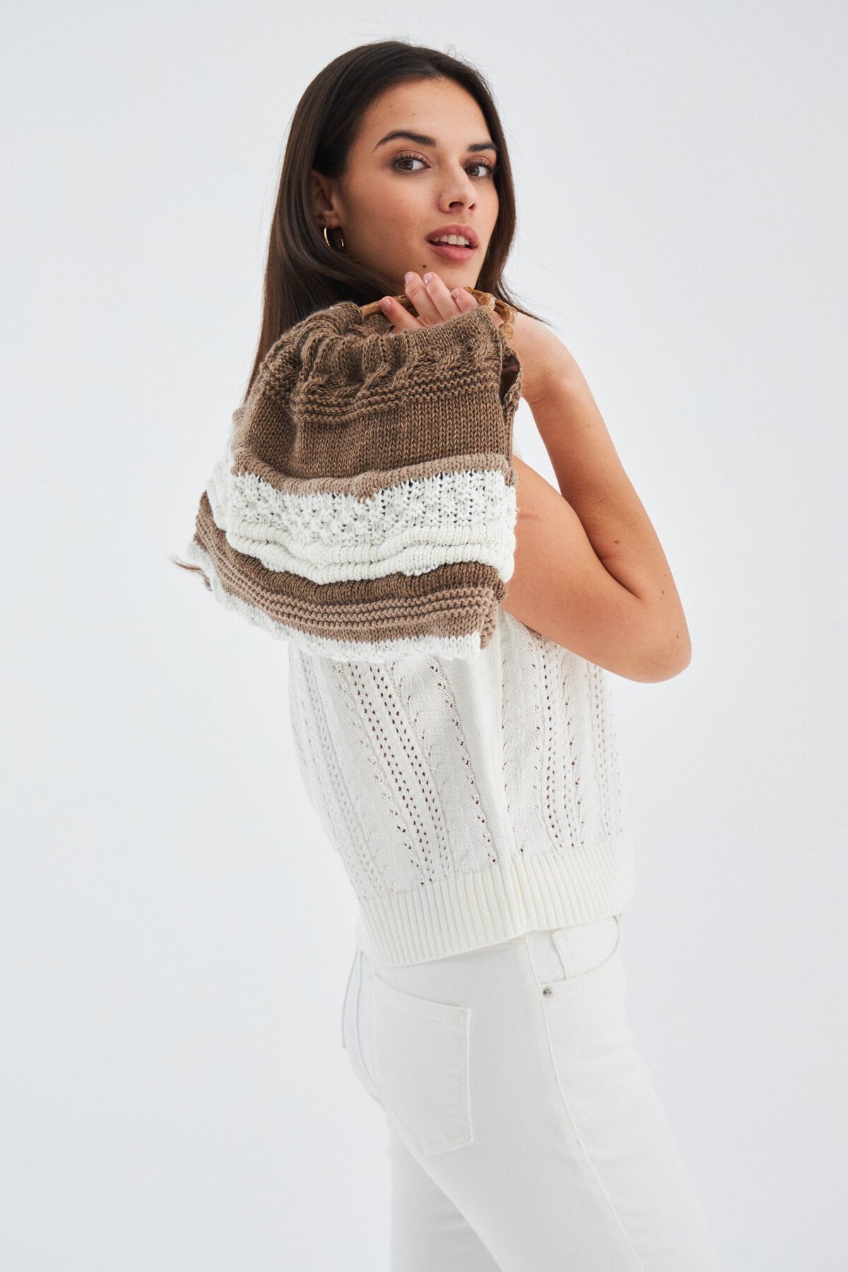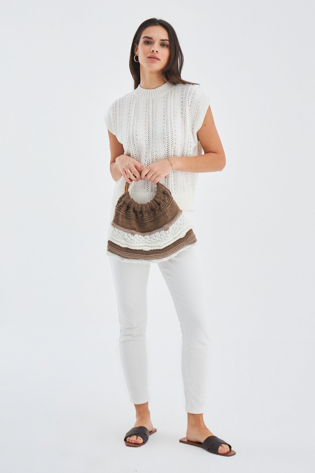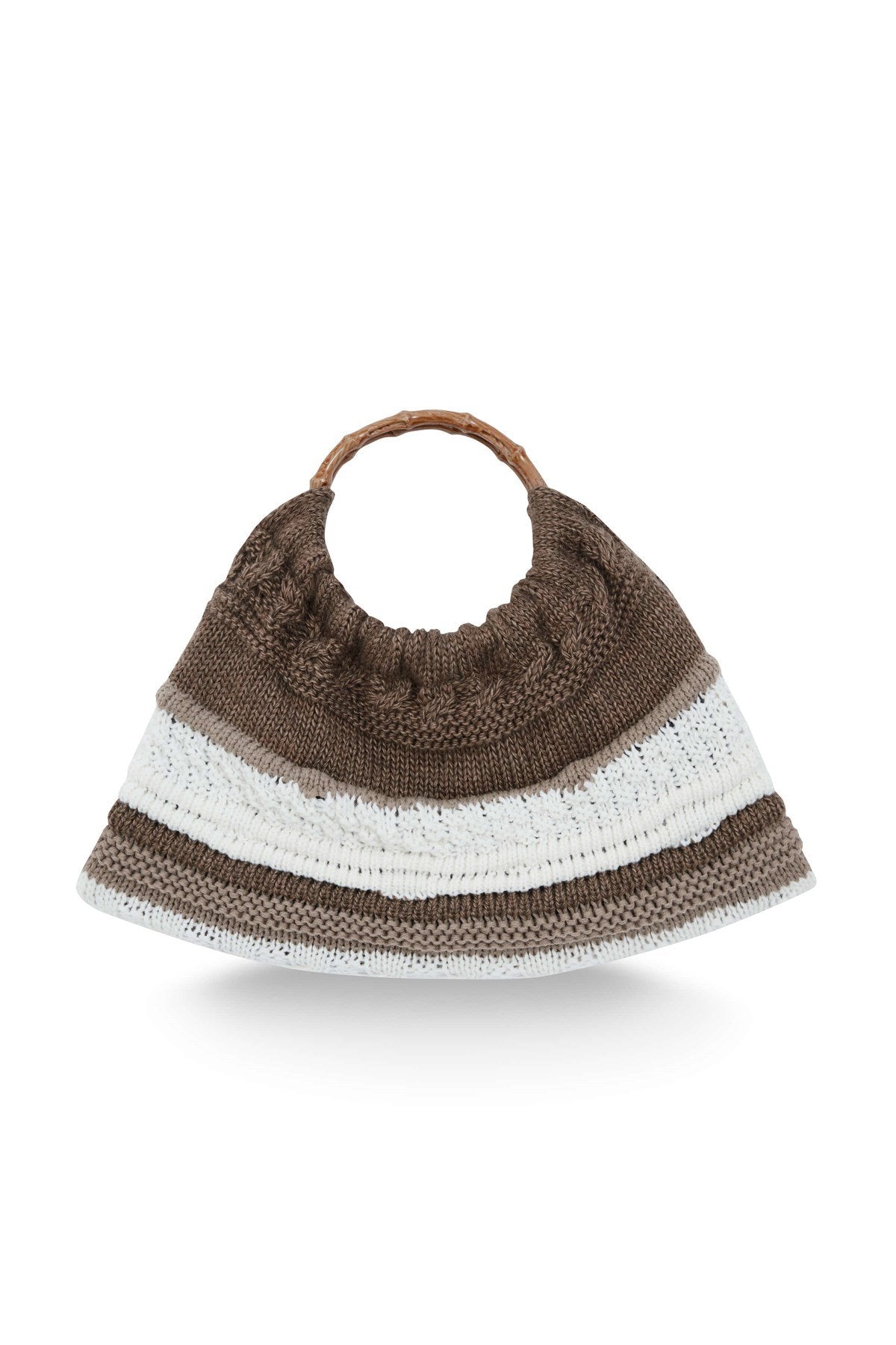 Joi Bag Yuvarlak Saplı Yazlık Kadın Triko Çanta Kahve/Ekru