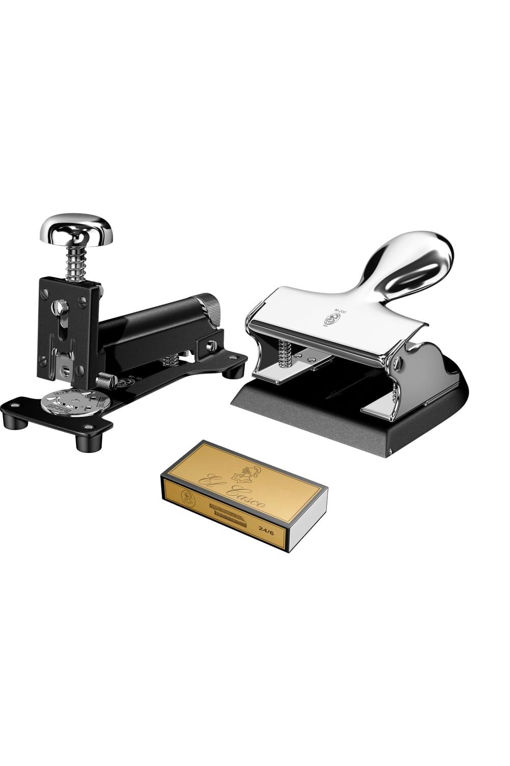 El Casco zımba ve delgeç seti 10-CN zımba ve 200-CN delgeçten oluşur. Optimal bir organizasyon sistemi için, herhangi bir masadan zımba ve delgeç asla eksik olmamalıdır. 1-CN zımba El Casco geleneğini, işçiliğini ve tasarımını korur ve 200-CN delgeç yuvarlak şekli ve klasik mekanizma ile ekstra zarafet katar. Her ikisi de siyah lake ve krom kaplama bileşenlere sahiptir. Bu ofis aksesuarları şık bir hediye kutusuyla paketlenmiştir ve bir arkadaş veya iş ortağı için ideal bir hediye olabilir.