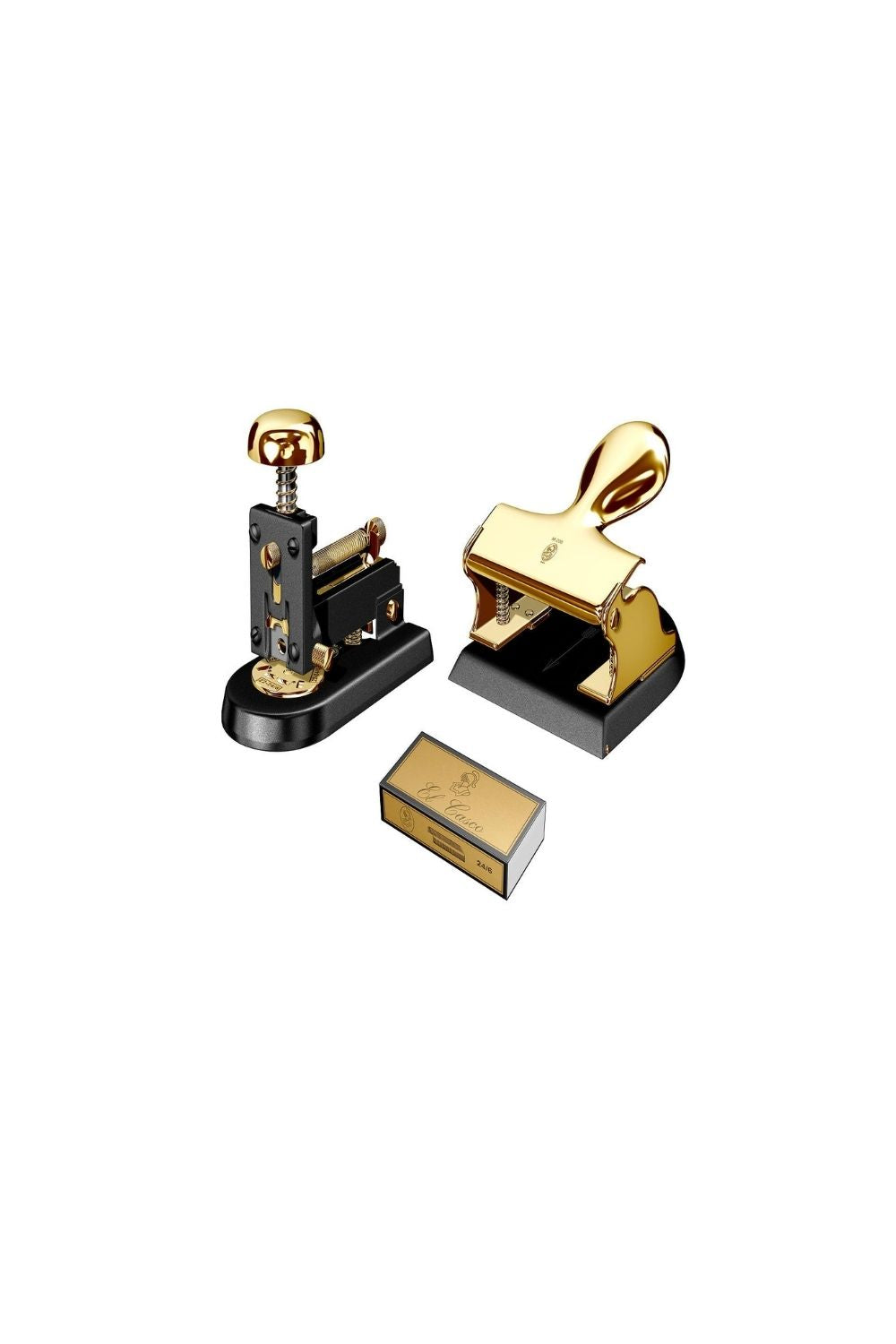 El Casco zımba ve delgeç seti 1-LN zımba ve 200-LN delgeçten oluşur. Optimal bir organizasyon sistemi için, herhangi bir masadan zımba ve delgeç asla eksik olmamalıdır. 1-LN zımba El Casco geleneğini, işçiliğini ve tasarımını korur ve 200-LN delgeç yuvarlak şekli ve klasik mekanizma ile ekstra zarafet katar. Her ikisi de siyah lake ve altın kaplama bileşenlere sahiptir. Bu ofis aksesuarları şık bir hediye kutusuyla paketlenmiştir ve bir arkadaş veya iş ortağı için ideal bir hediye olabilir.