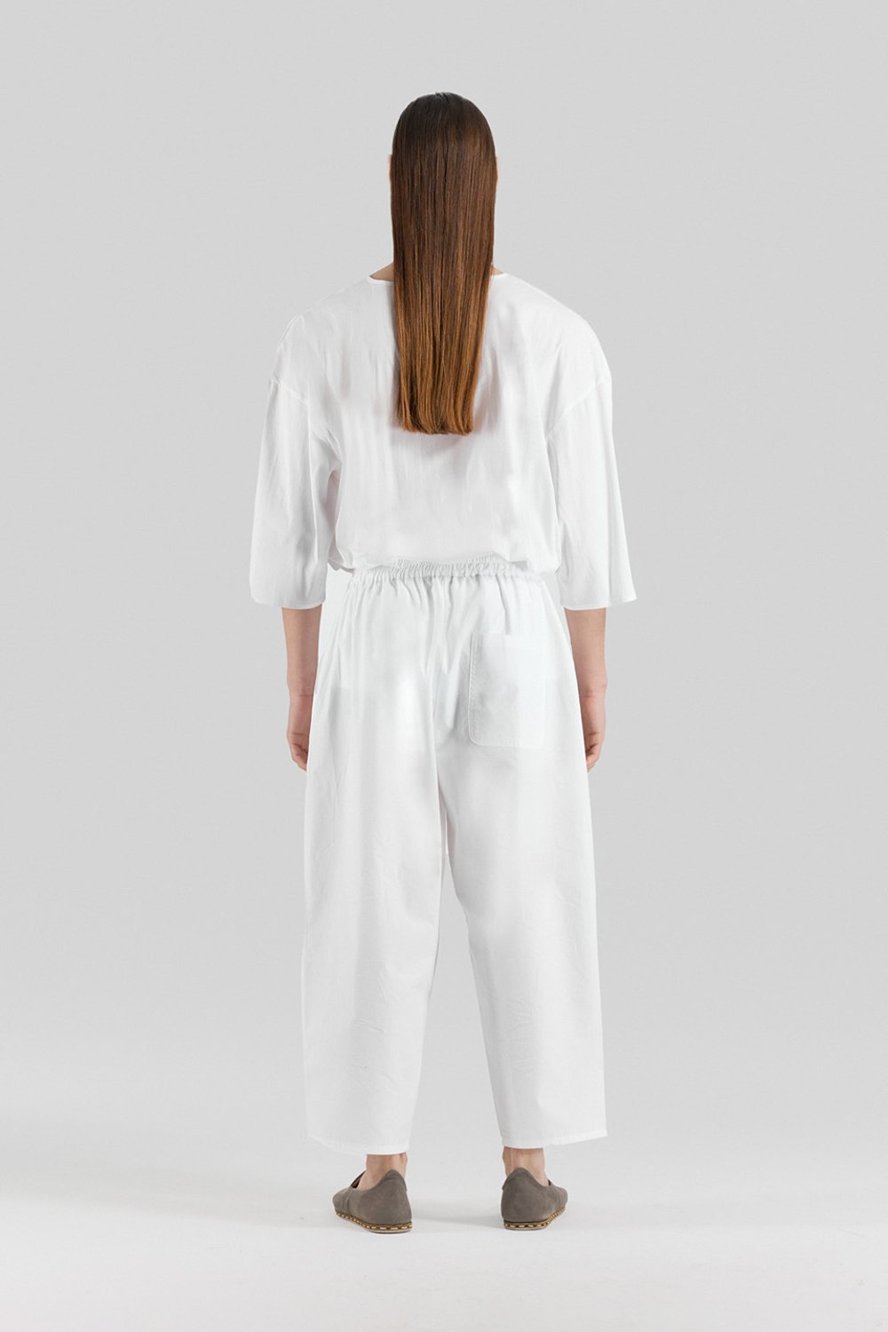 Beyaz, oversize pantolon. Ayarlanabilir elastik belli. Hafif dokusu ve nefes aldıran kumaşıyla rahatlığı ve şıklığı bir arada sunar.