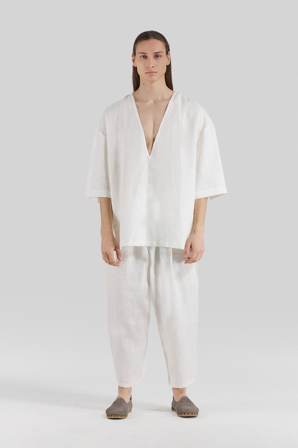 Beyaz %100 Keten Derin V Yaka Oversized Erkek T-Shirt Model T 11