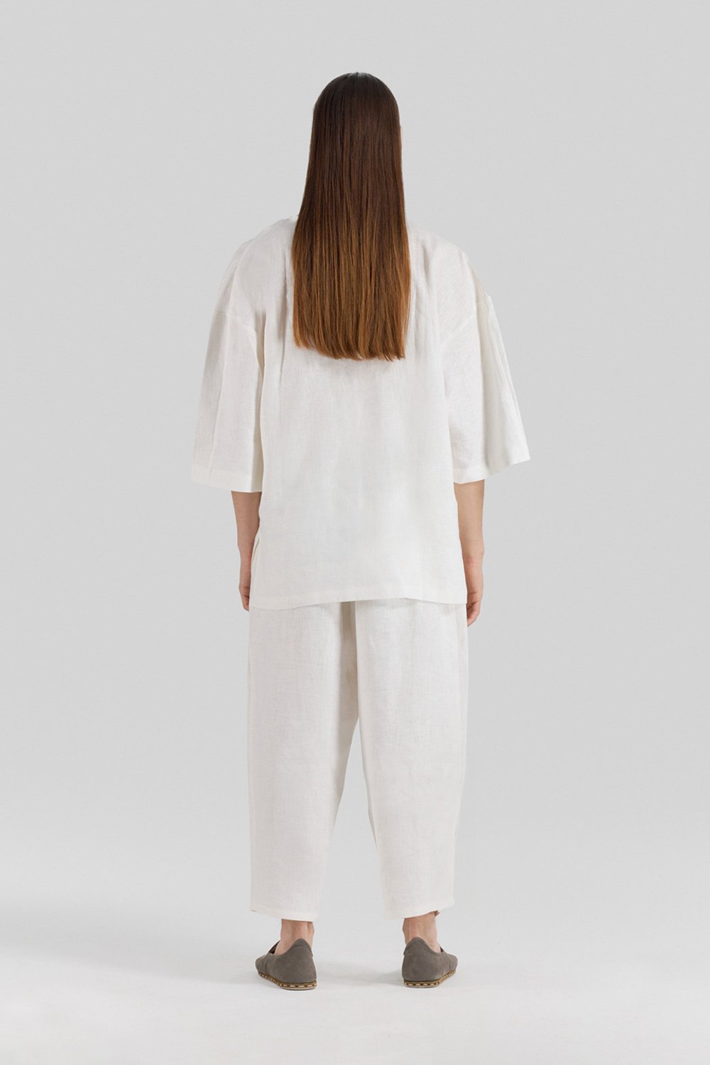 Beyaz, oversize tişört. Ön tarafındaki derin “V” kesimi ve ince keten kumaşıyla minimalizmi ve cesareti bir arada sunar.