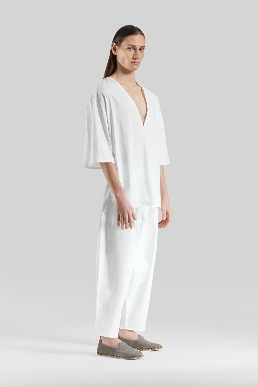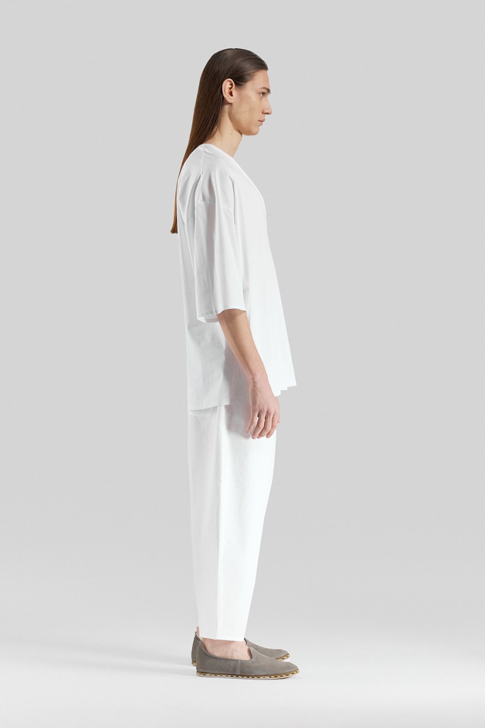 Beyaz, oversize tişört. Ön tarafındaki derin “V” kesimi tasarımıyla minimalizmi ve cesareti bir arada sunar.