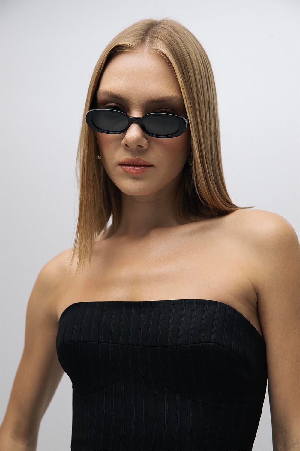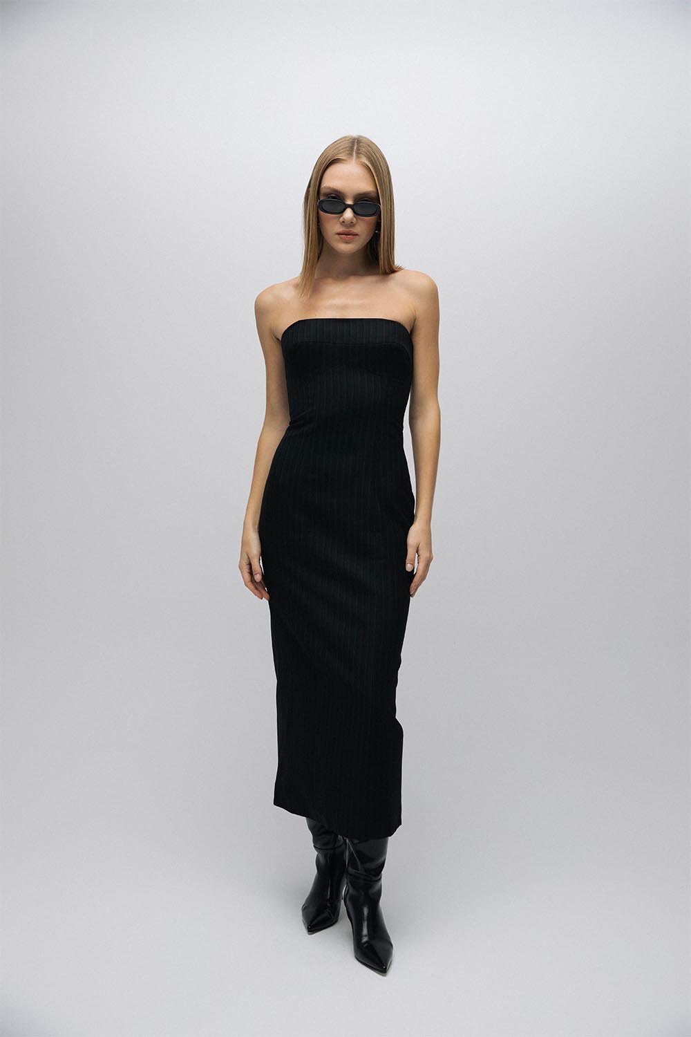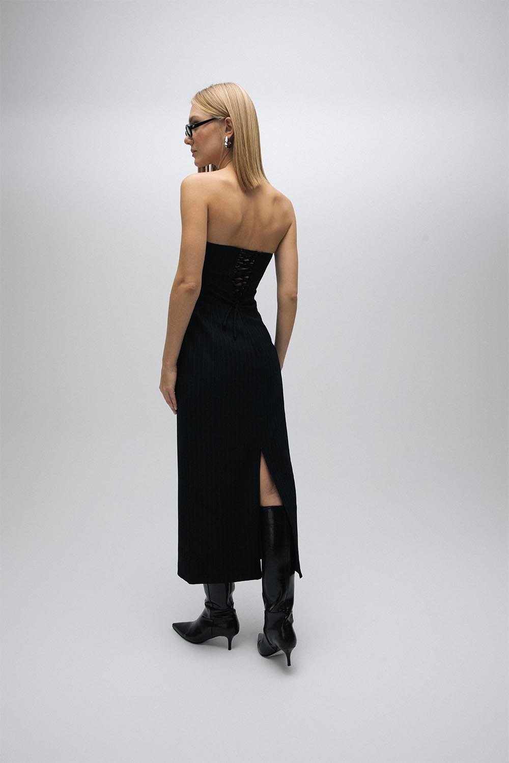 Straplez midi elbise, arkadaki bağcık detayı ve fermuarlı yırtmaç özelliğiyle dikkat çeker. İnce çizgili dokusu, tasarımı bir hava katarken vücuda oturan kesimiyle feminen bir siluet sunar.