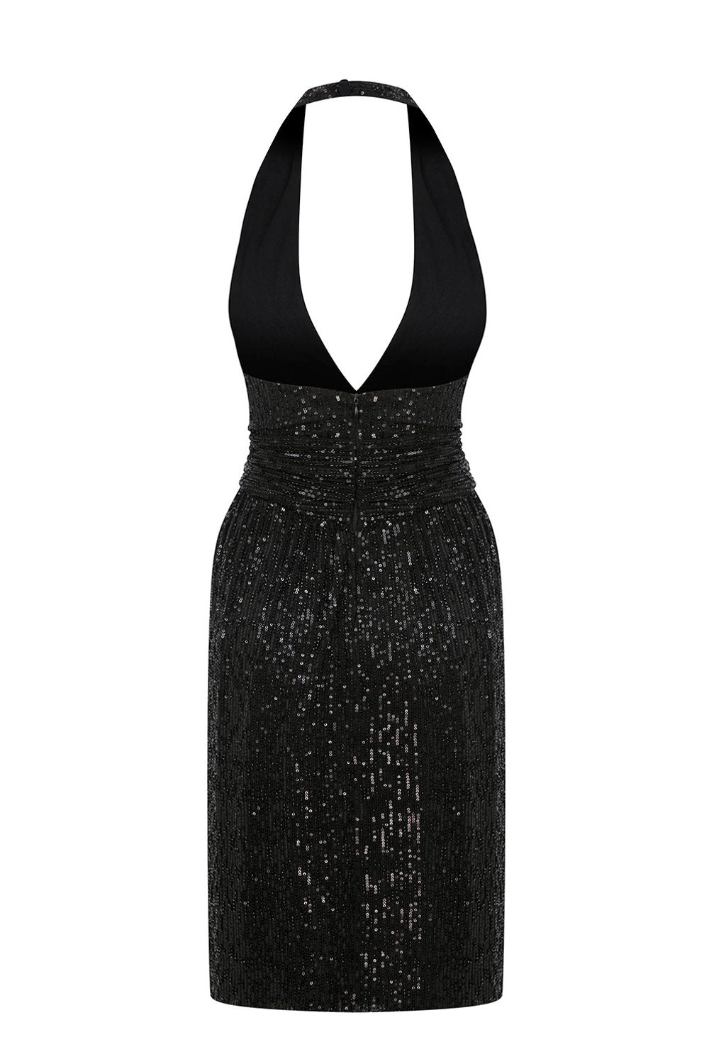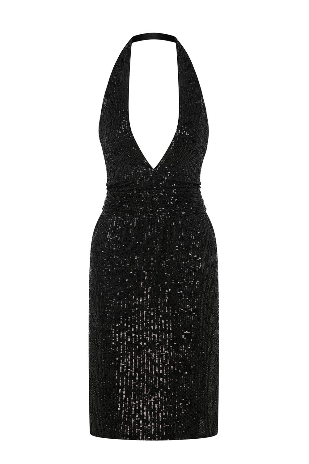 Parlak boncuk ve payet işlemeli zarif halter yaka tasarım, derin V kesimli ve belden drapeli elbise.