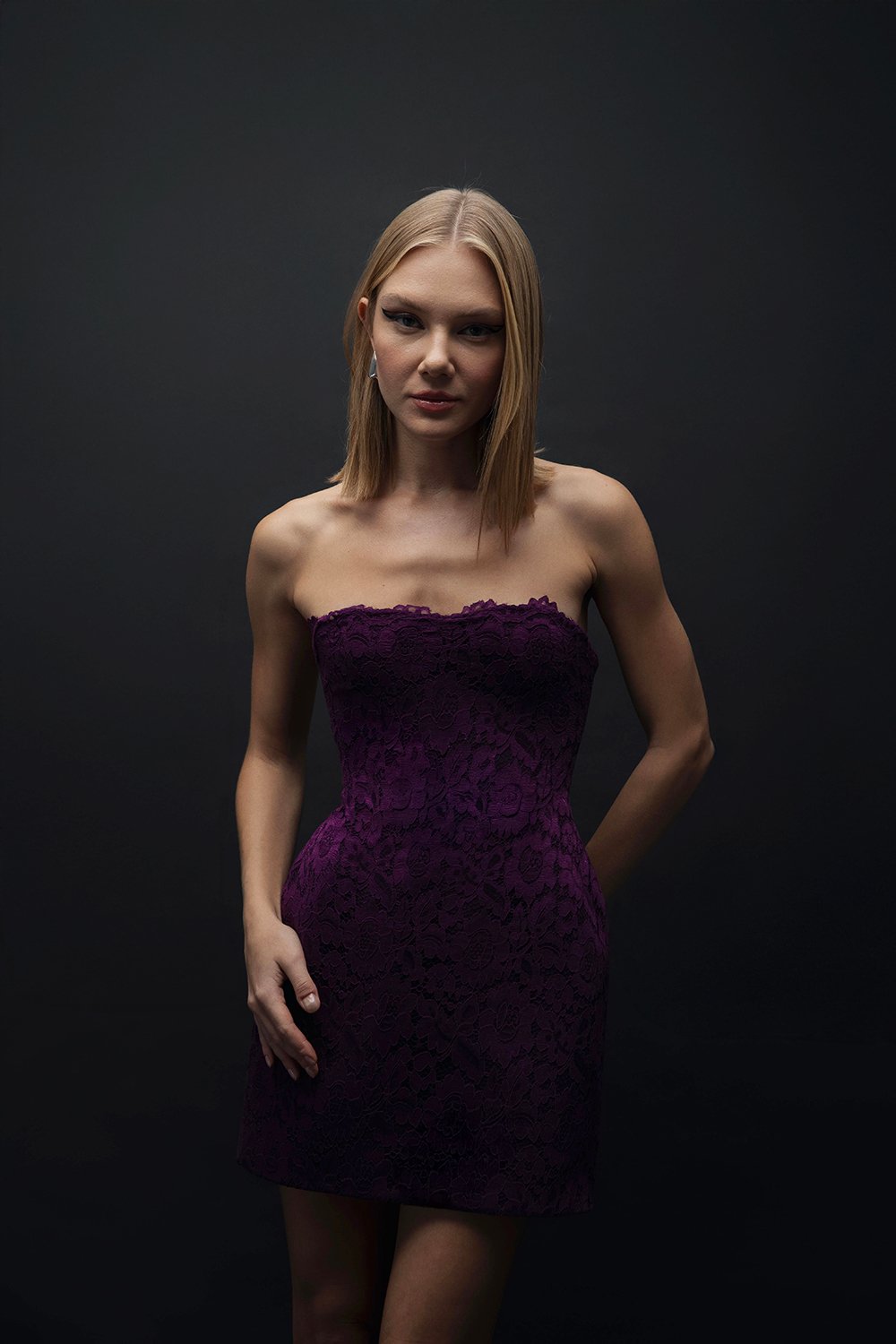 Straplez, mor dantel dokusuyla öne çıkmaktadır. Vücut hatlarını incelikle vurgulayan kesimi,dantel detayları olan elbiseye mini boy elbise.