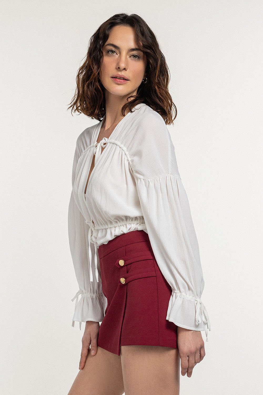 Günlük giyimde şık ve spor bir parça olarak, iş hayatında şık kombinler ile bir araya getirebileceğiniz gold düğme detaylı şort etek rahatlığı şıklık ile birleştiren bir tasarım.