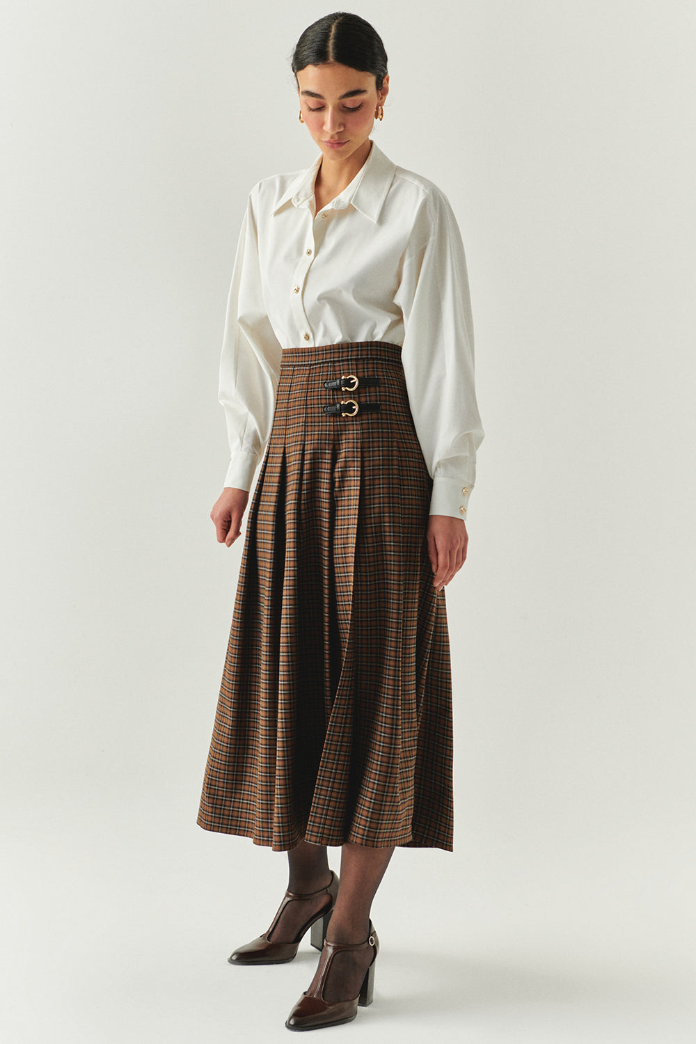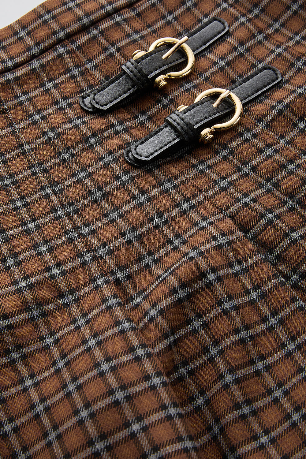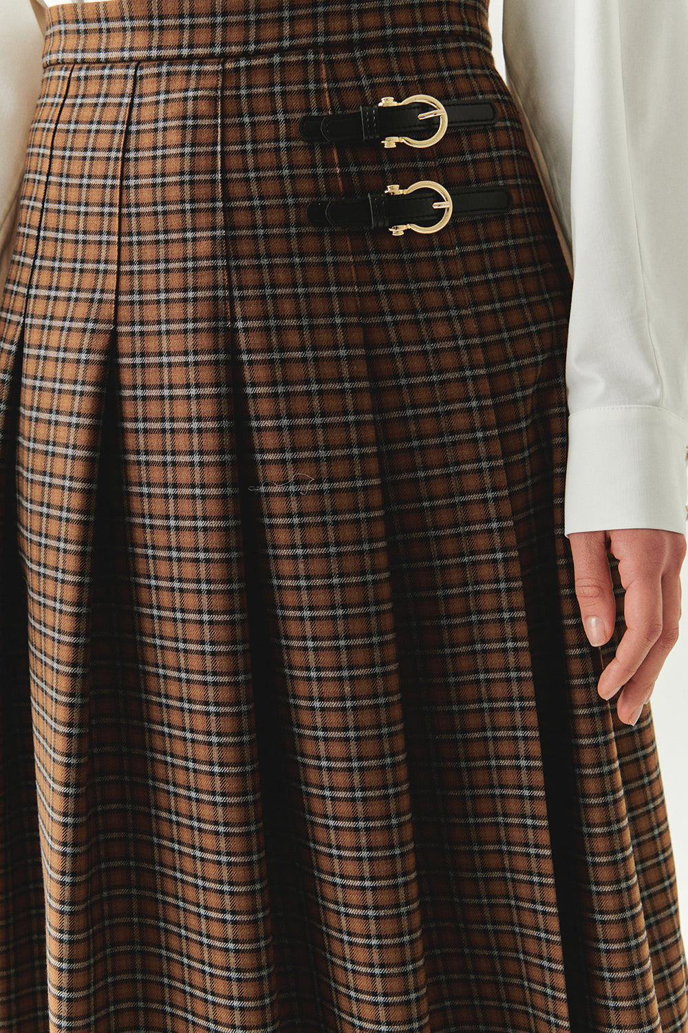 Ekose deseni ve deri tokalı kemer detayıyla öne çıkan bu regular kesim midi etek, yüksek bel tasarımı ve yırtmaç detayıyla hem şık hem de modern bir görünüm sunar. Günlük stilinizi sofistike bir dokunuşla tamamlamak için idealdir.