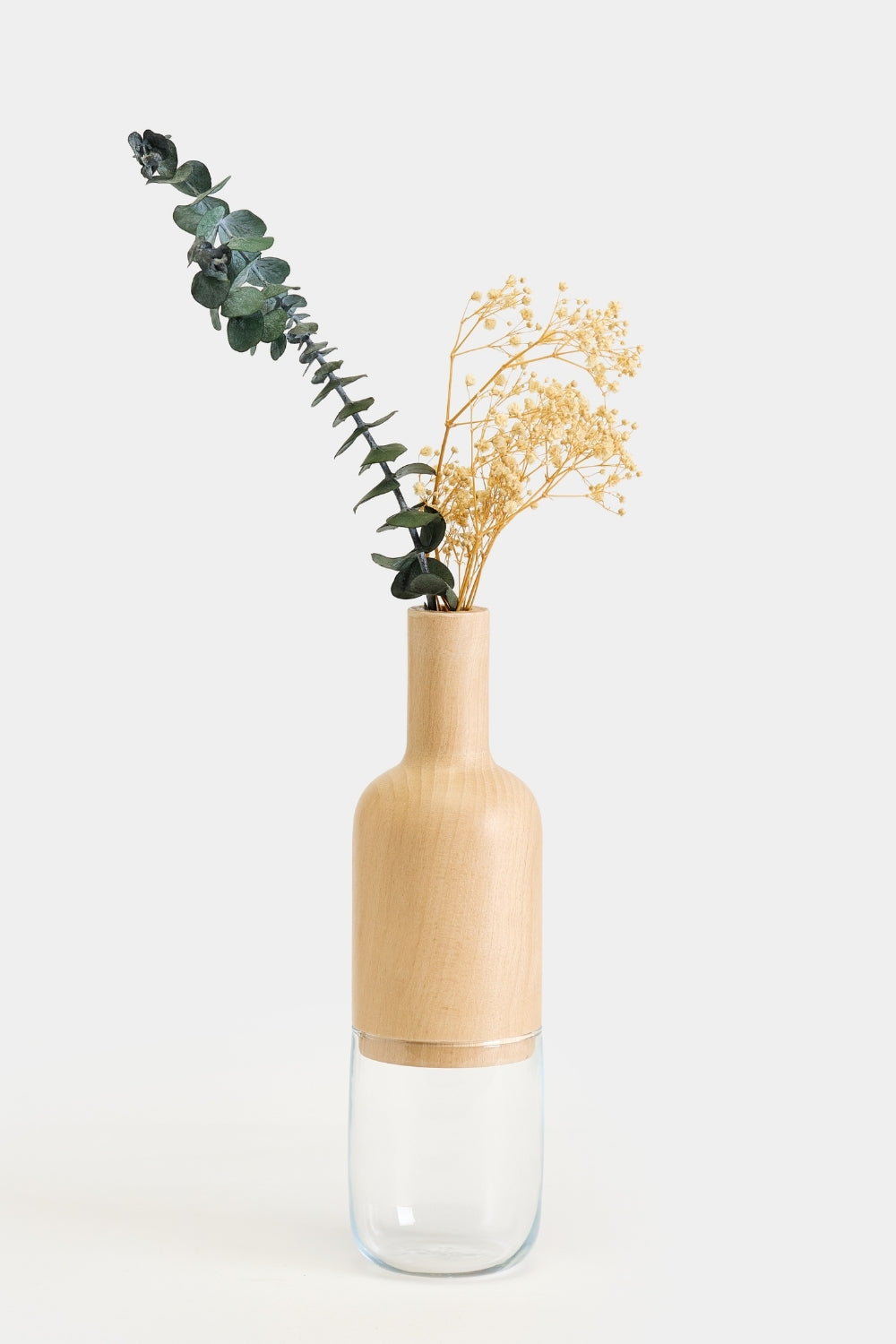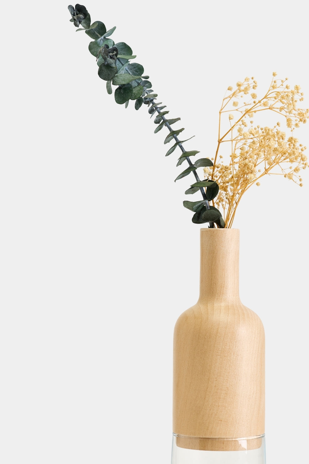 Tarz ve İlham:Masif ahşabın sıcaklığı ve köklü duruşu, camın saydam ve hafif yapısıyla buluşur. Ahşap ve cam kısmının yumuşak ve silindirik hatları içine koyacağınız bitkilerin veya çiçeklerin gövdesini ve suyunu gizemli bir atmosferde tutarak meditatif bir ortam yaratır.