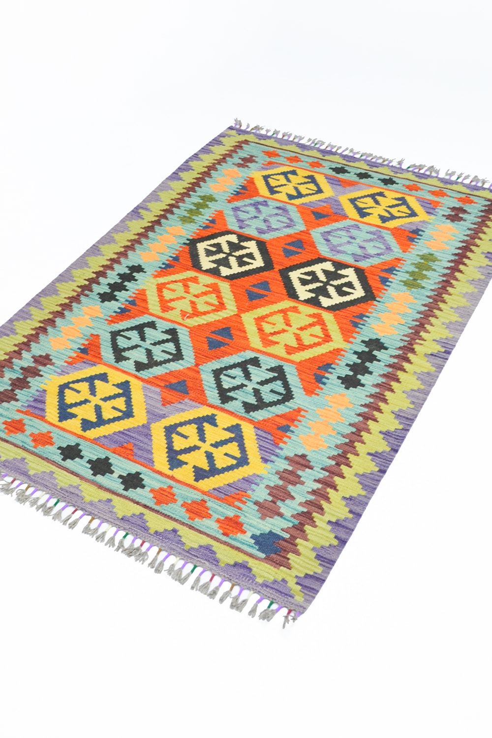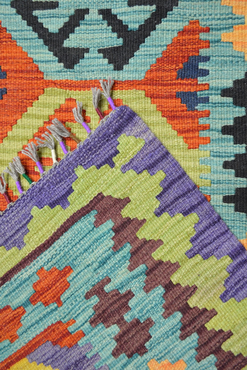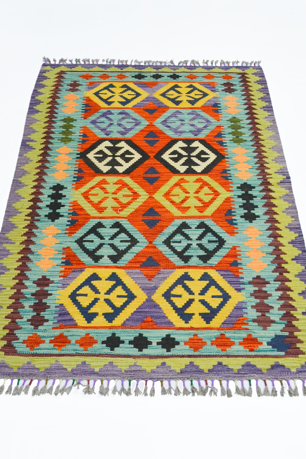 Afganistan’ın köklü dokuma geleneğini yansıtan bu el dokuma kilim, 103x152 cm (1.57 m²) ölçülerindedir. %100 yünden üretilen kilim, canlı ve çok renkli tasarımıyla mekânlara hareket ve enerji katar.