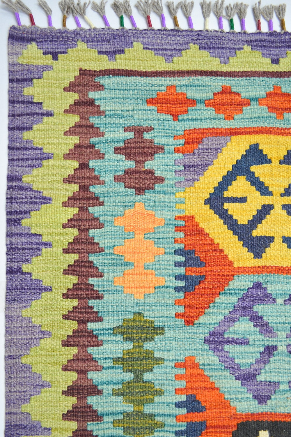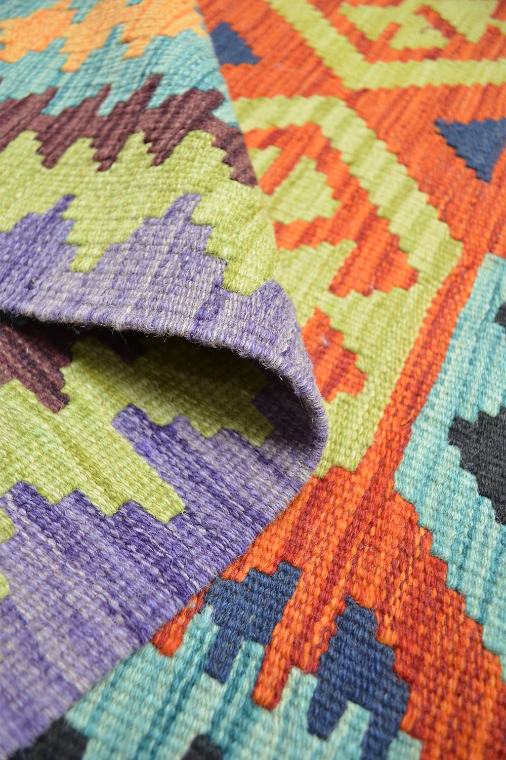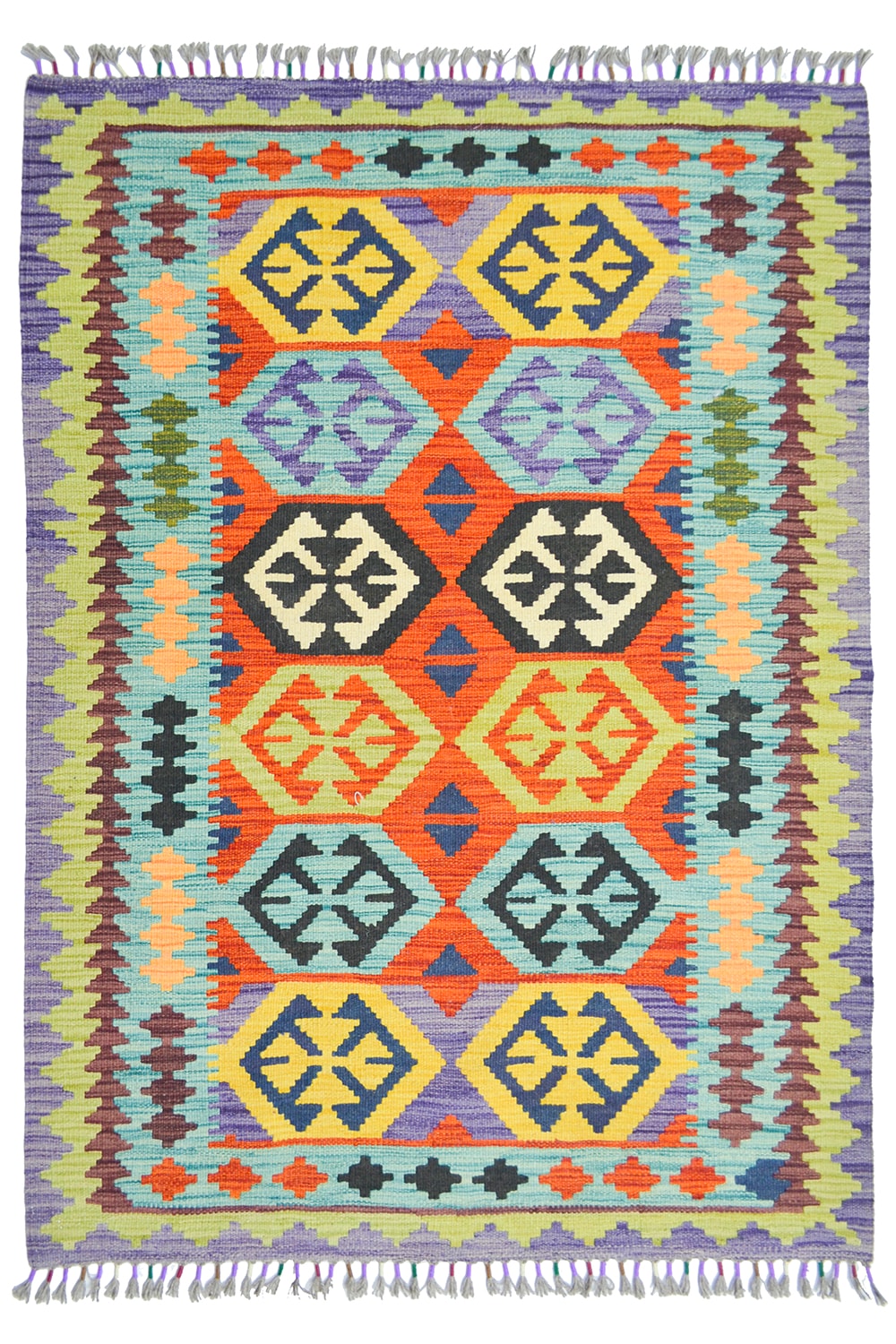 Afganistan’ın köklü dokuma geleneğini yansıtan bu el dokuma kilim, 103x152 cm (1.57 m²) ölçülerindedir. %100 yünden üretilen kilim, canlı ve çok renkli tasarımıyla mekânlara hareket ve enerji katar.