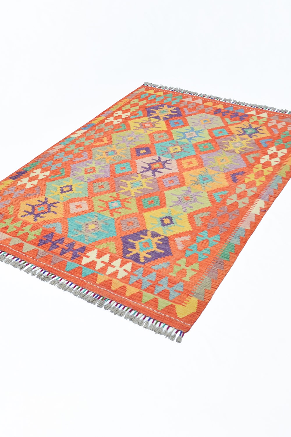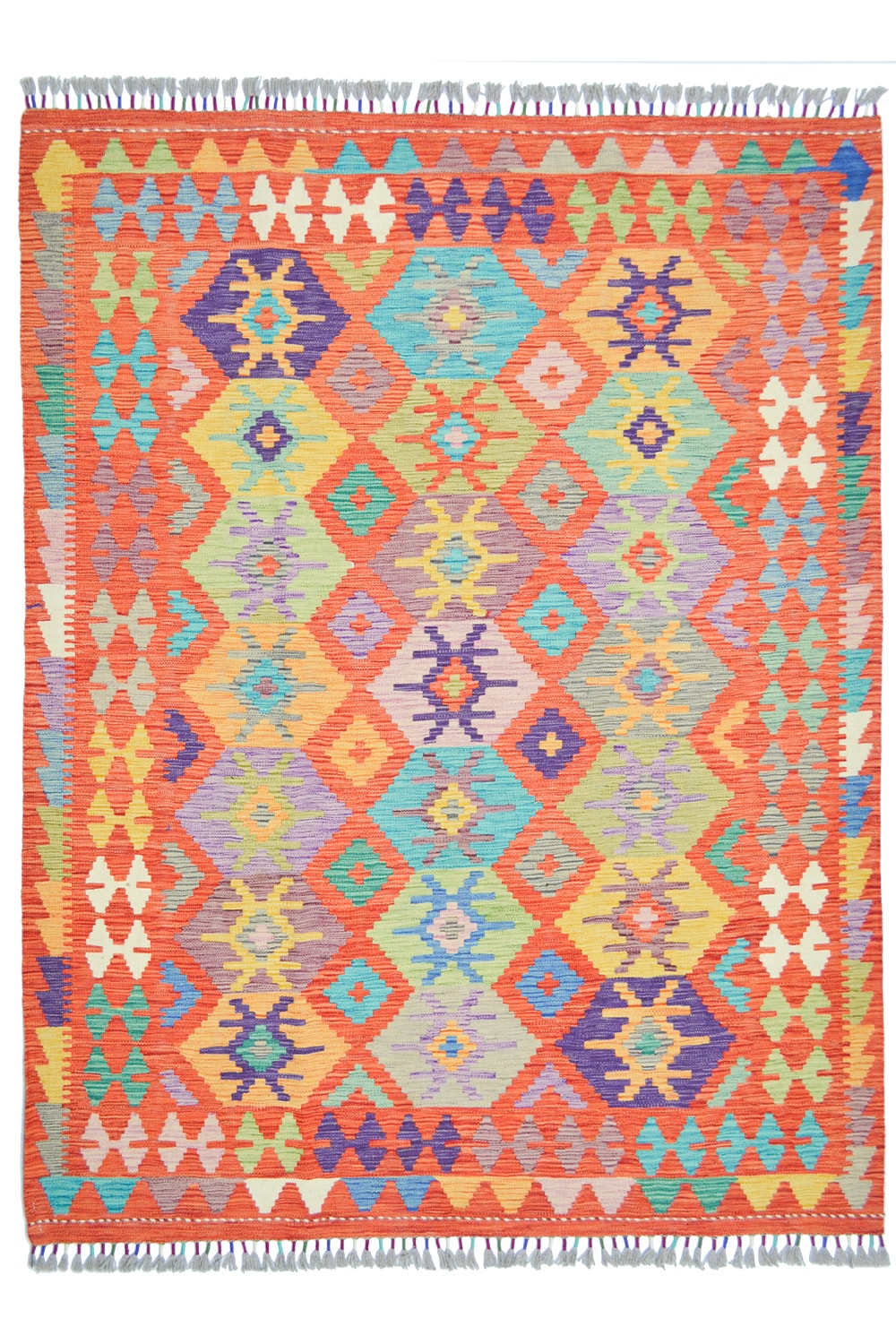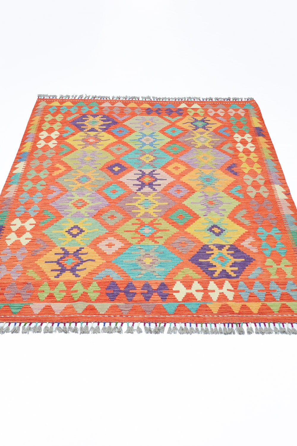 Afganistan’ın köklü dokuma geleneğini yansıtan bu el dokuma kilim, 150x202 cm (3.03 m²) ölçülerindedir. %100 yünden üretilen kilim, canlı ve çok renkli tasarımıyla mekânlara hareket ve enerji katar.