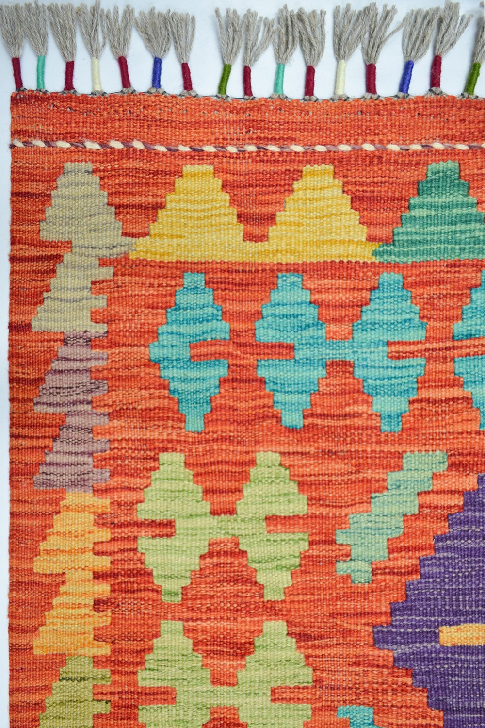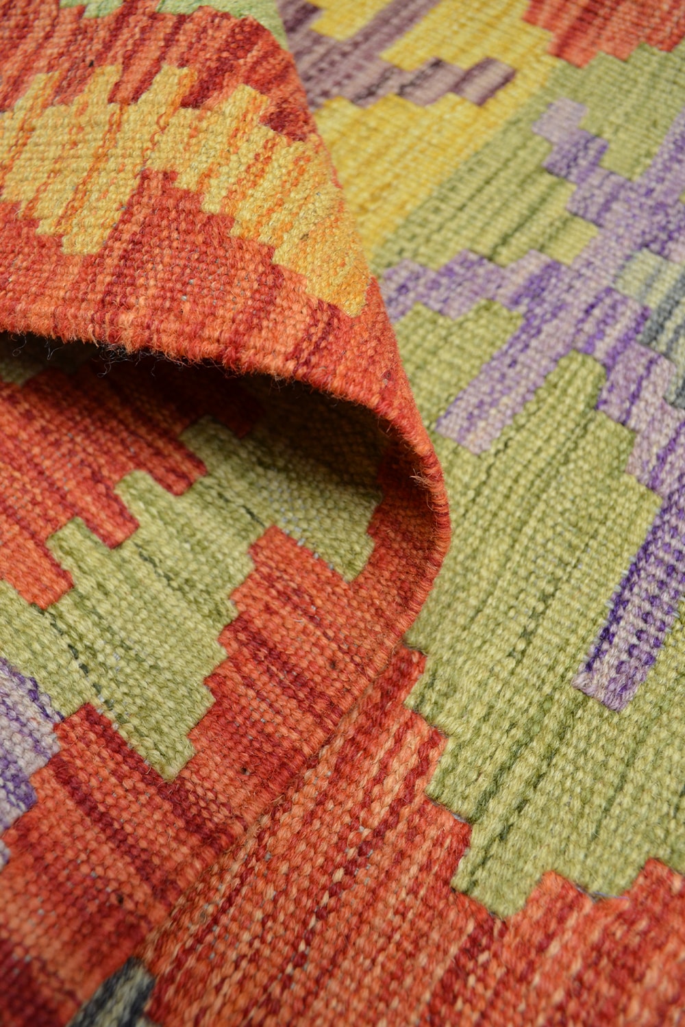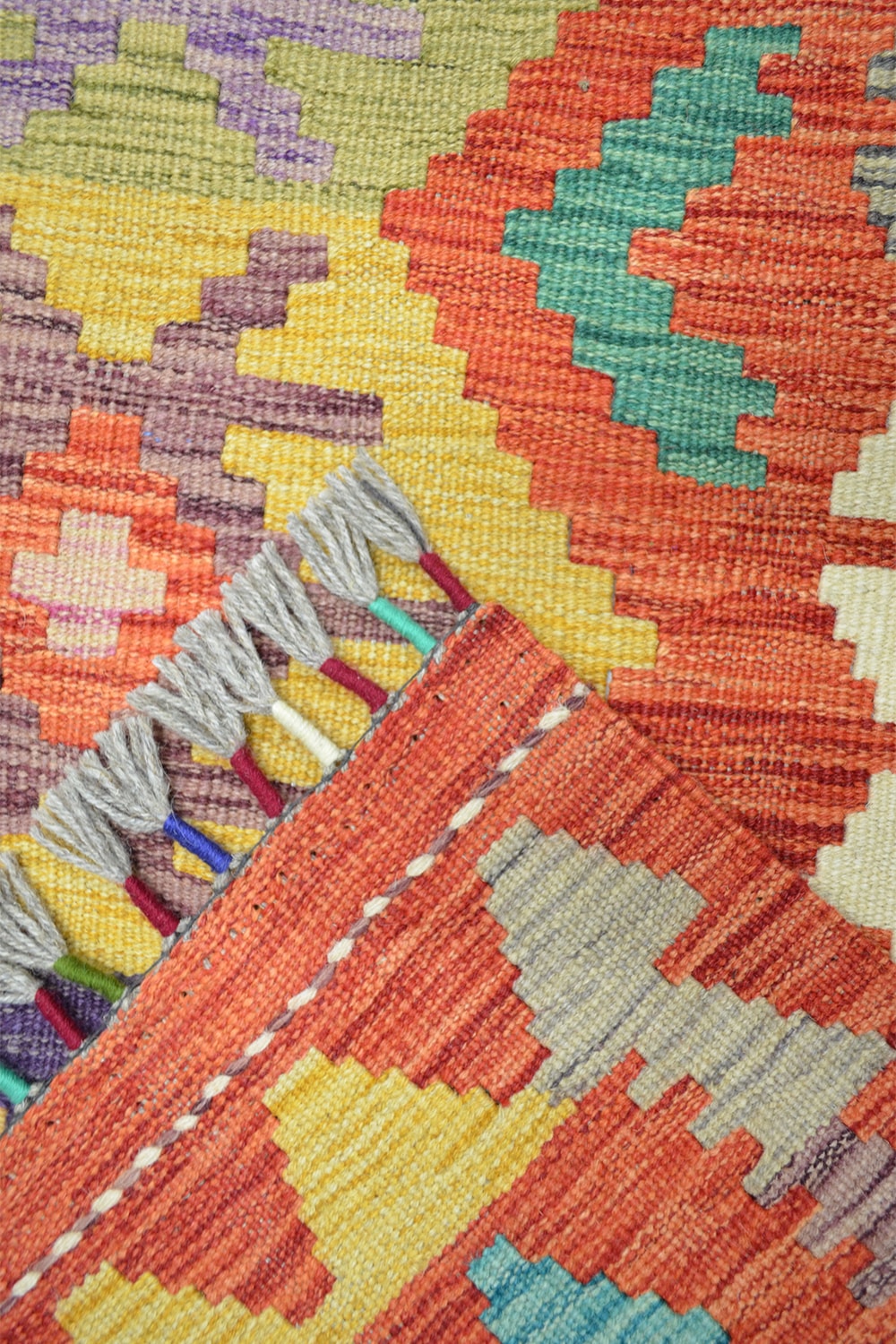 Afganistan’ın köklü dokuma geleneğini yansıtan bu el dokuma kilim, 150x202 cm (3.03 m²) ölçülerindedir. %100 yünden üretilen kilim, canlı ve çok renkli tasarımıyla mekânlara hareket ve enerji katar.
