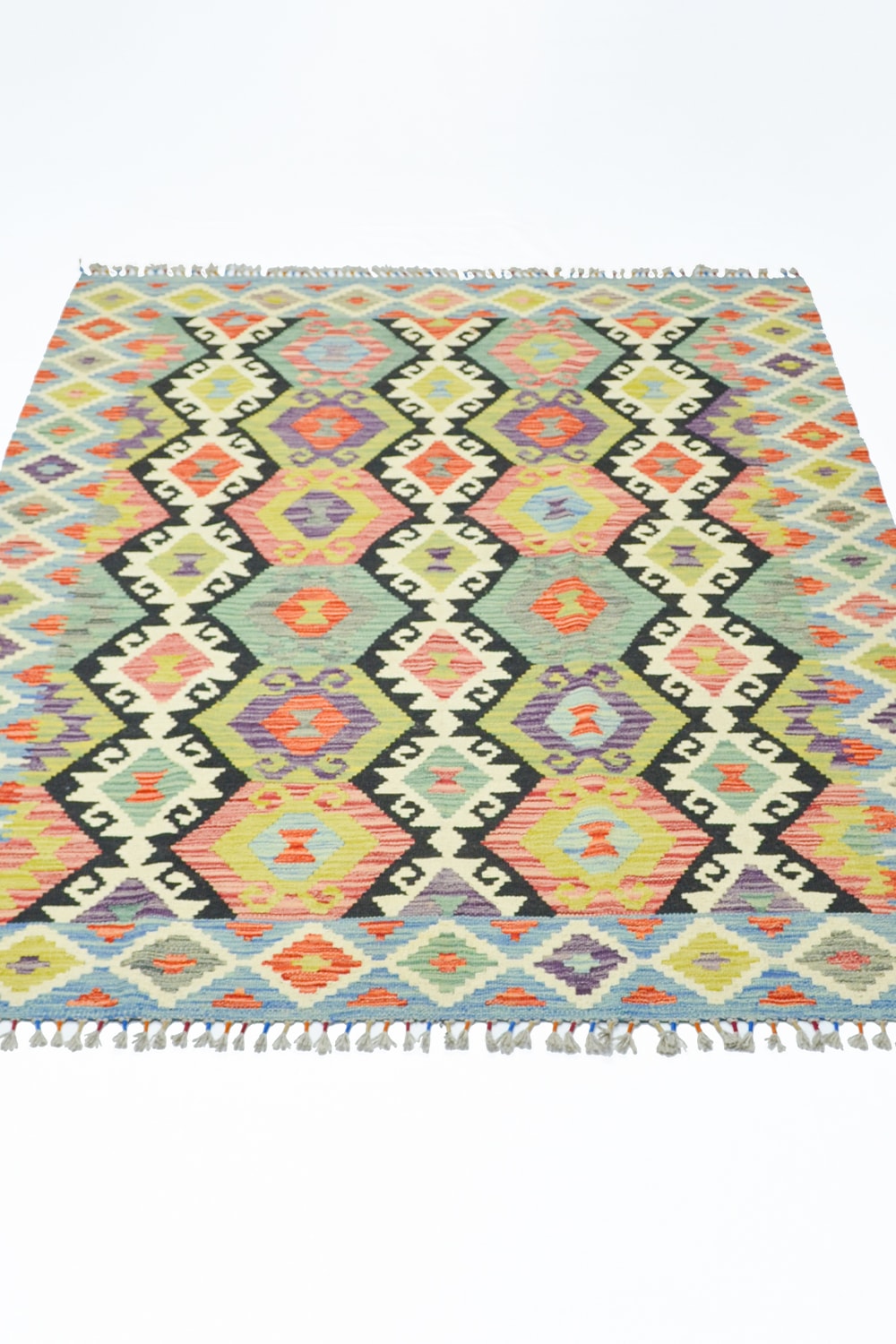 Afganistan’ın köklü dokuma geleneğini yansıtan bu el dokuma kilim, 155x201 cm (3.12 m²) ölçülerindedir. %100 yünden üretilen kilim, canlı ve çok renkli tasarımıyla mekânlara hareket ve enerji katar.