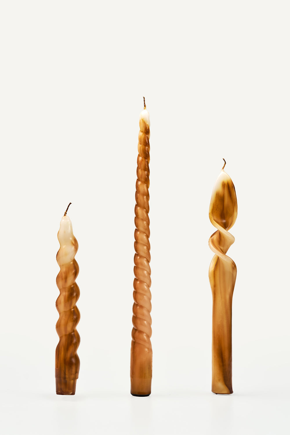 Her sette birbirinden farklı formda 3 adet mum yer alır ve her biri elde dökülerek üretilmiştir.