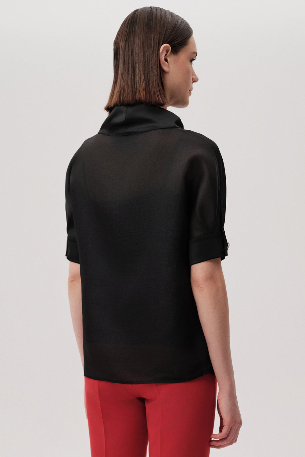 Kısa Kollu Astarlı Boğazlı Dökümlü Yaka Regular Organze Siyah Bluz