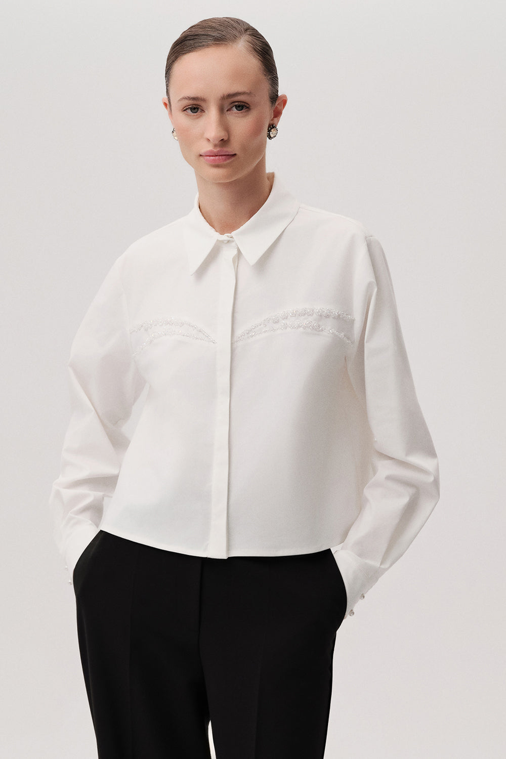 Pamuklu kumaşı ve kristal taş detaylarıyla öne çıkan bu kemik renkli gömlek, slim fit kesimi sayesinde vücuda zarifçe oturarak modern bir siluet sunar. Uzun kollu yapısı gün boyu konfor sağlarken, sade tasarımına eklenen kristal taşlar modele şık ve sofistike bir dokunuş kazandırır.