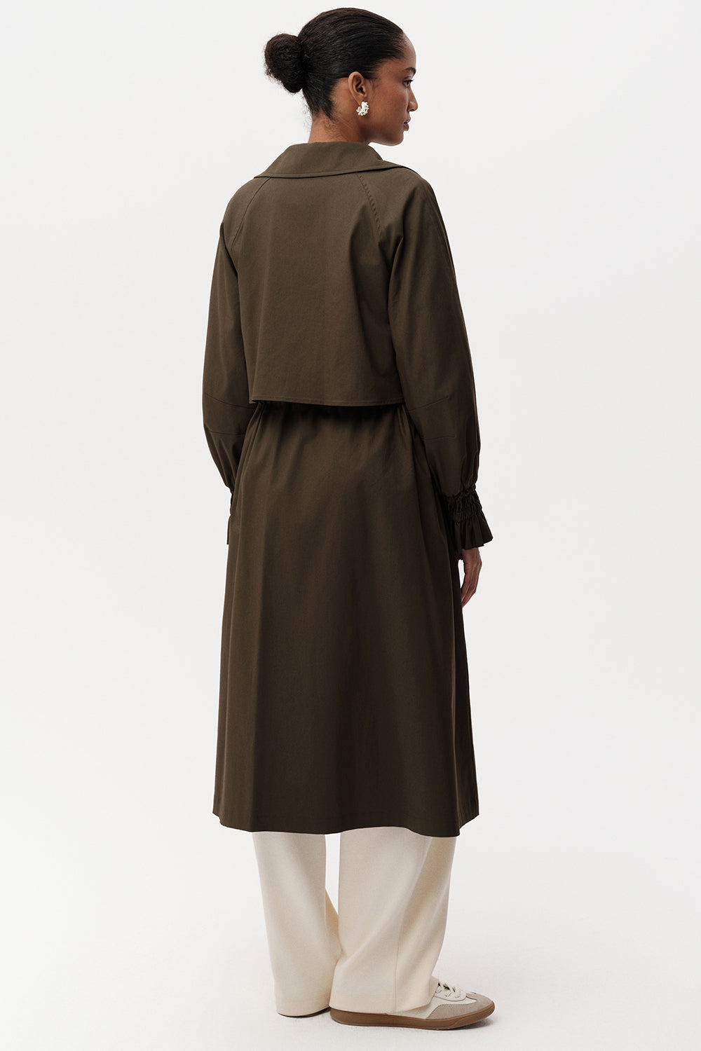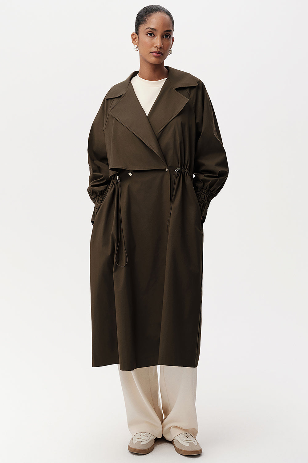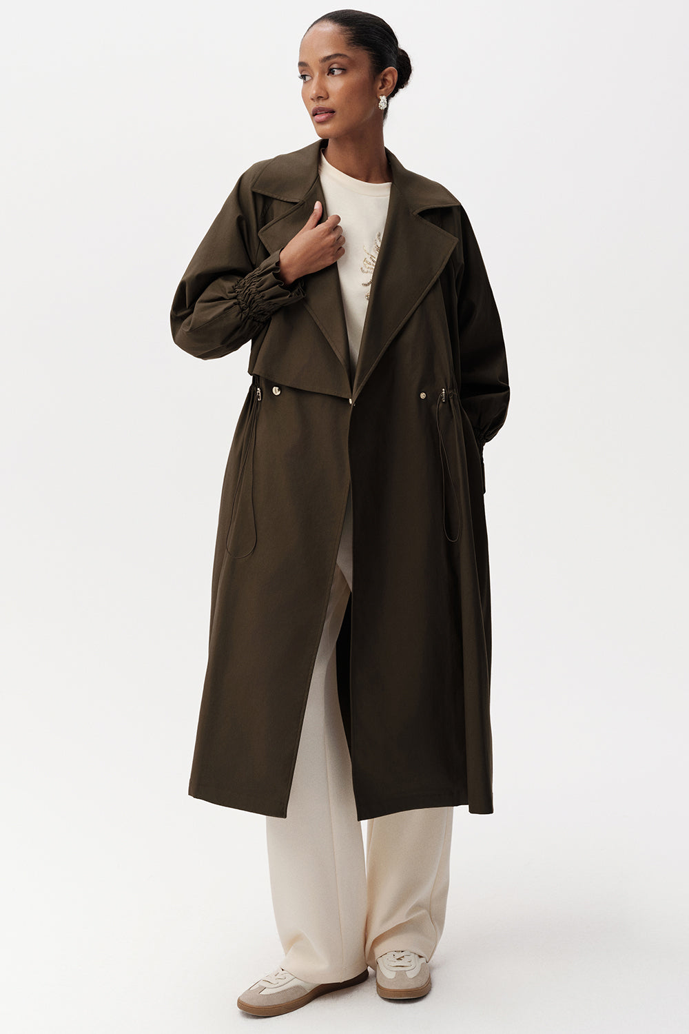 Uzun formda tasarlanan bu trençkot, mevsim geçişlerinde konforlu bir kullanım sunan hafif dokulu kumaştan üretilmiştir. Bel kısmındaki ayarlanabilir büzgü detayı sayesinde vücuda uyumlu bir siluet elde edilirken, geniş yaka tasarımı ve düşük omuz kesimi modele modern bir duruş kazandırır. Kol uçlarındaki lastikli büzgü detayları hem rahatlık sağlar hem de tasarım bütünlüğünü tamamlar.