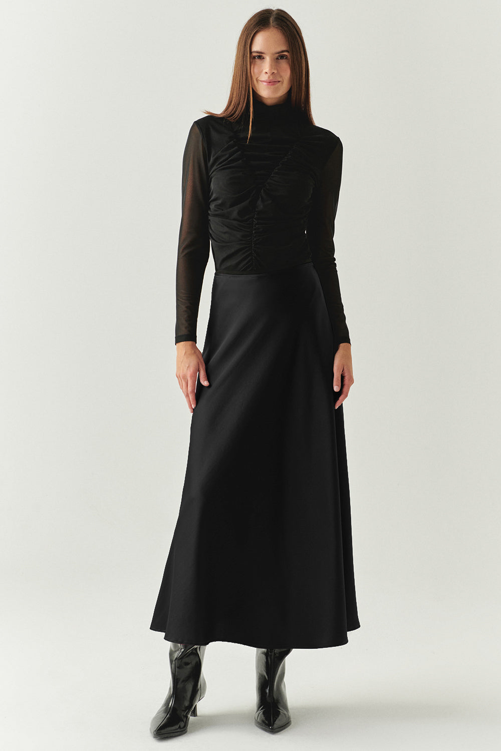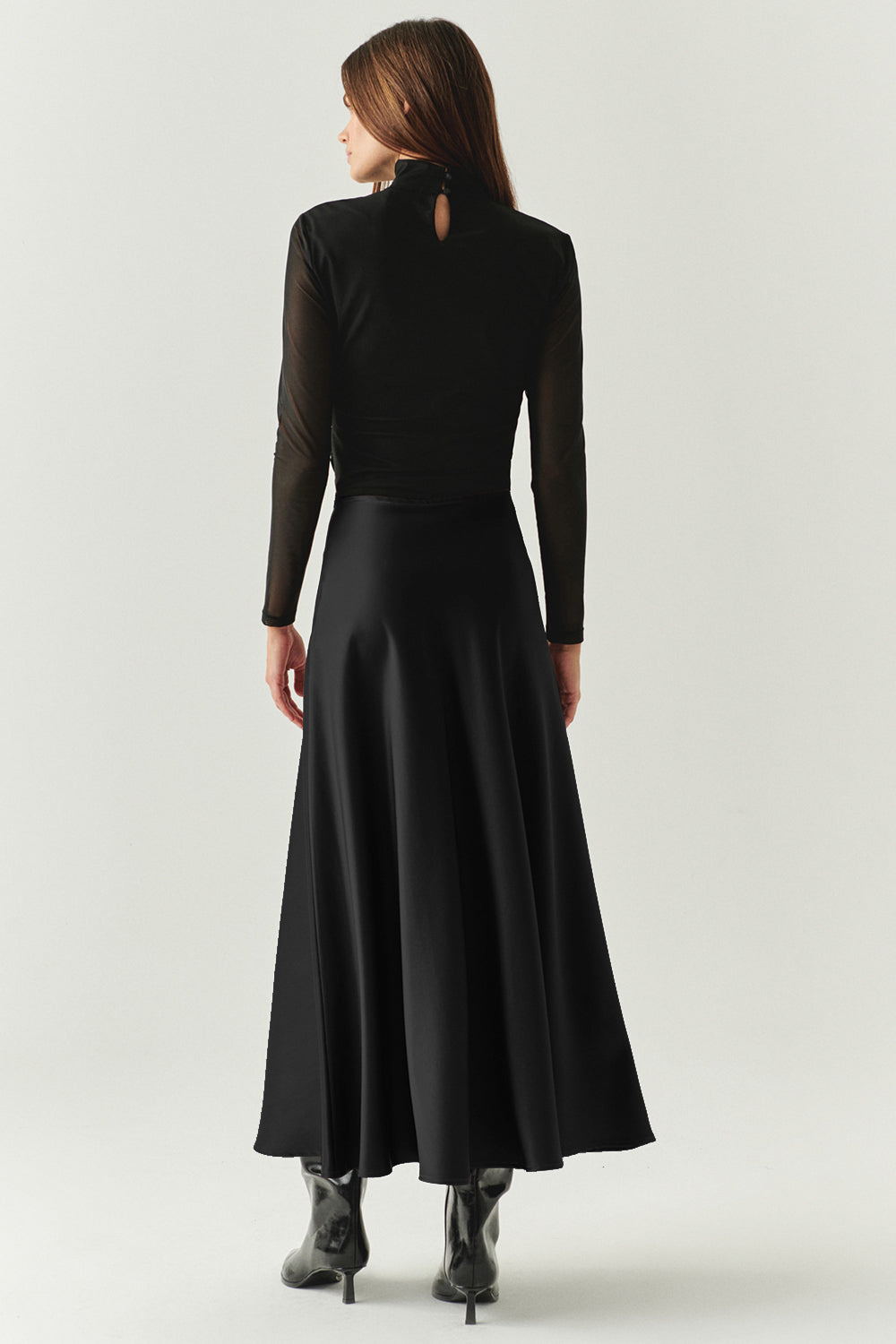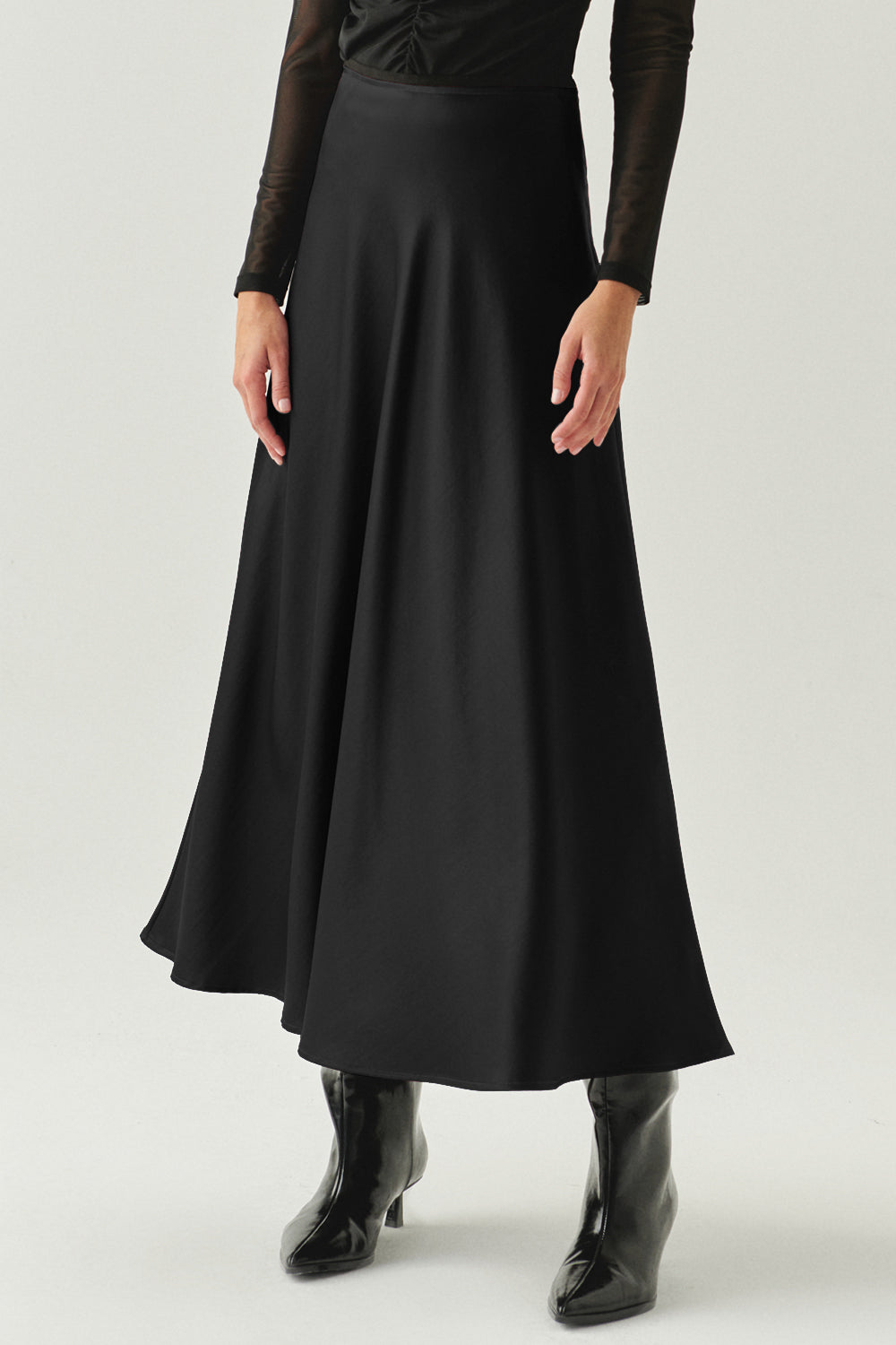 Yandan Fermuarlı Yüksek Bel Grogren Detaylı Saten Regular Siyah Midi Etek