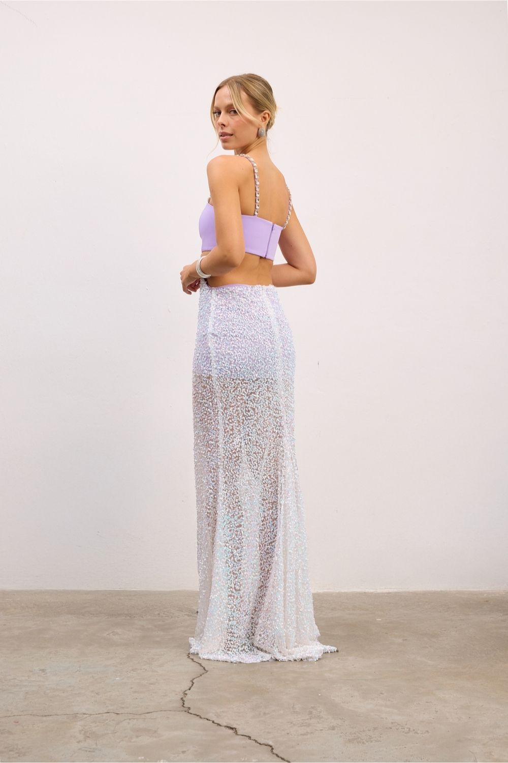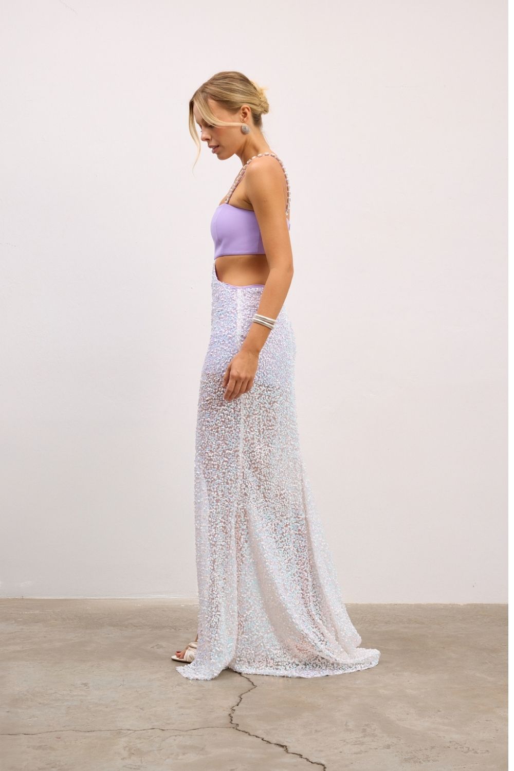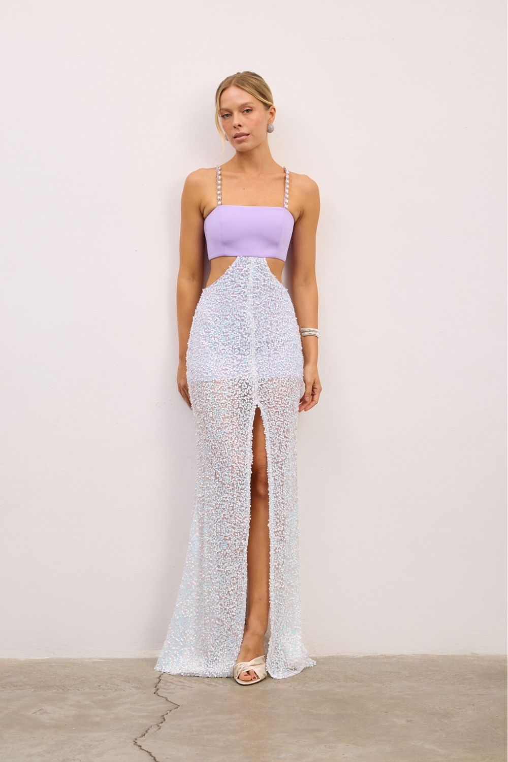 kesim kuyruklu, önden derin yırtmaçlı payet kumaş davet elbisesi