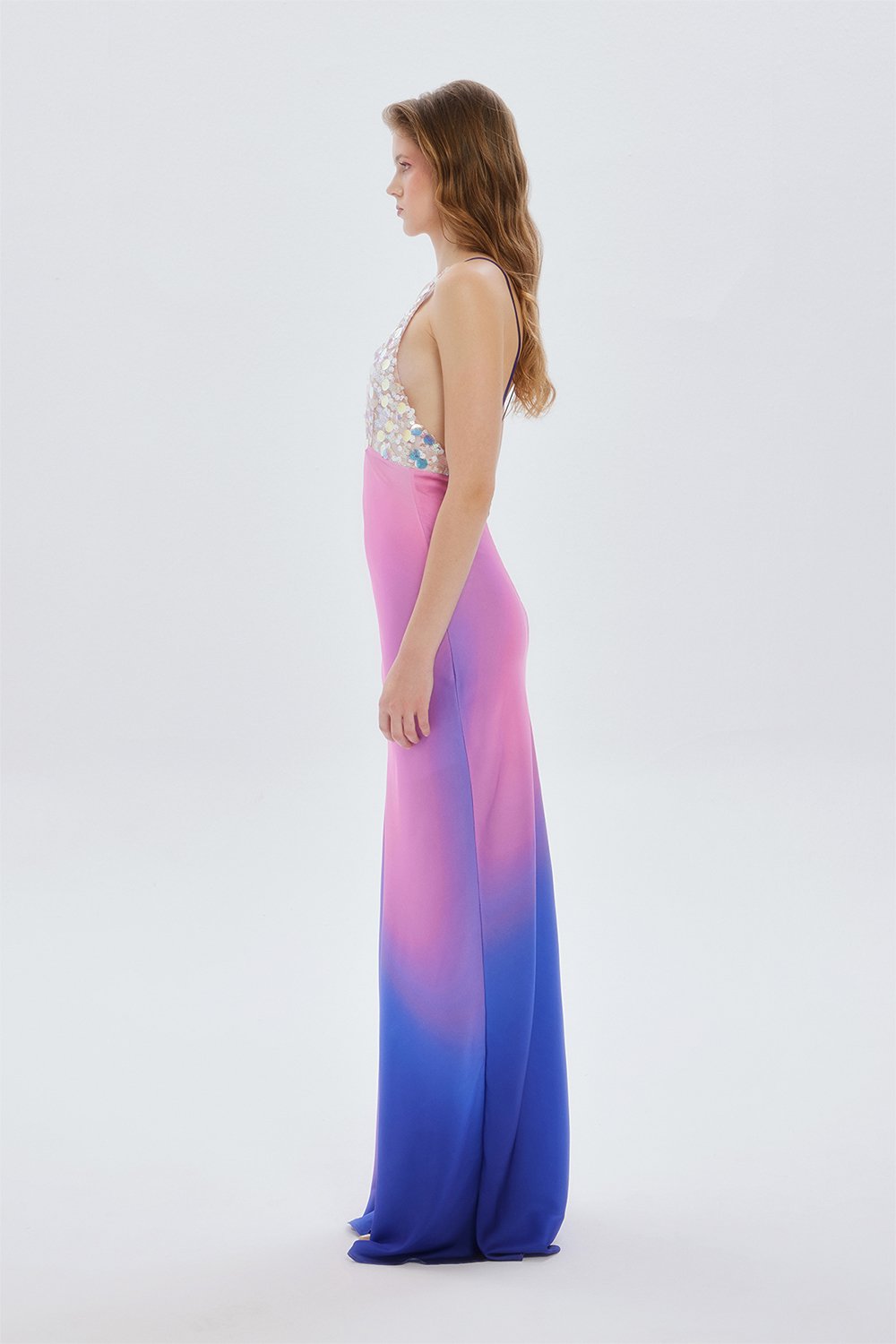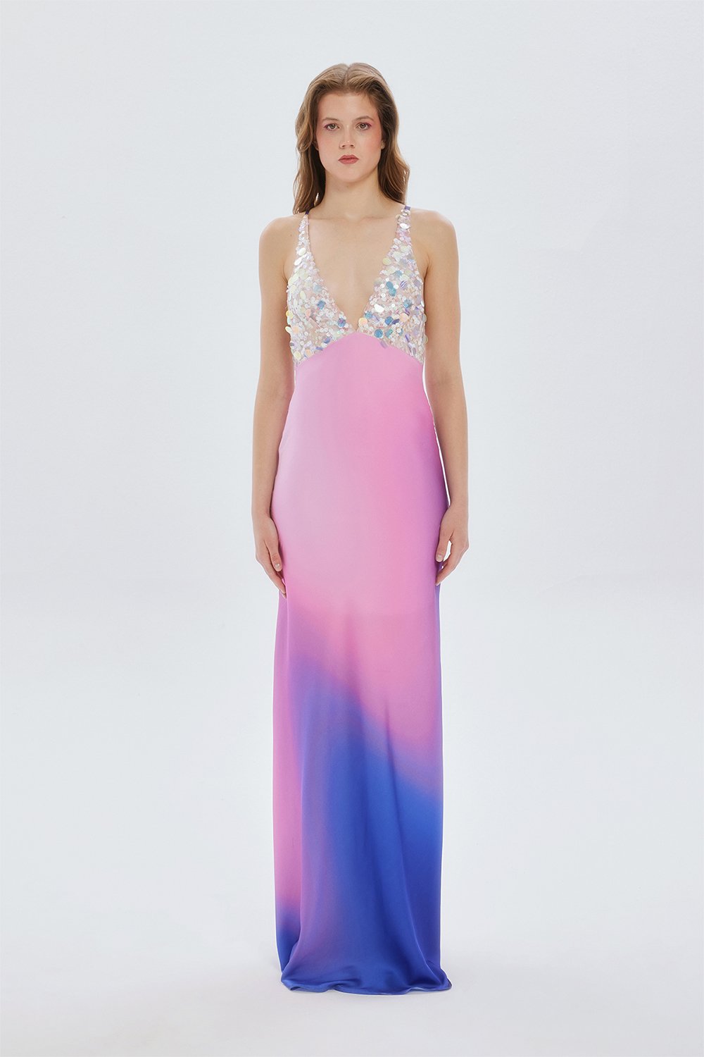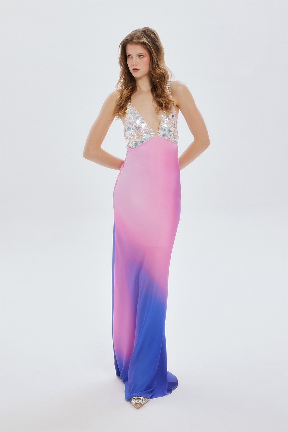 Siren Maxi Saten Yaka Payet Detaylı Degrade Uzun Davet Elbisesi