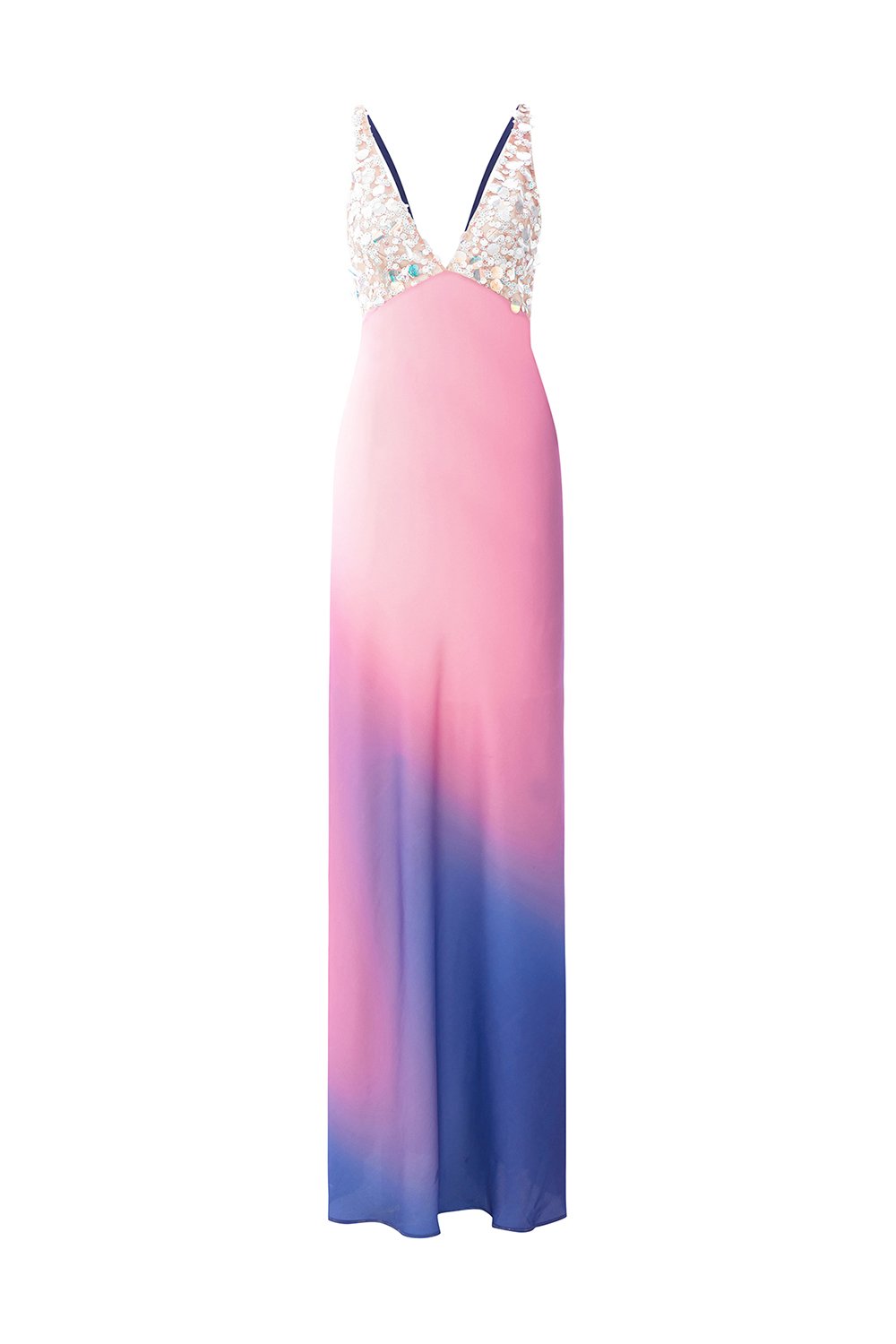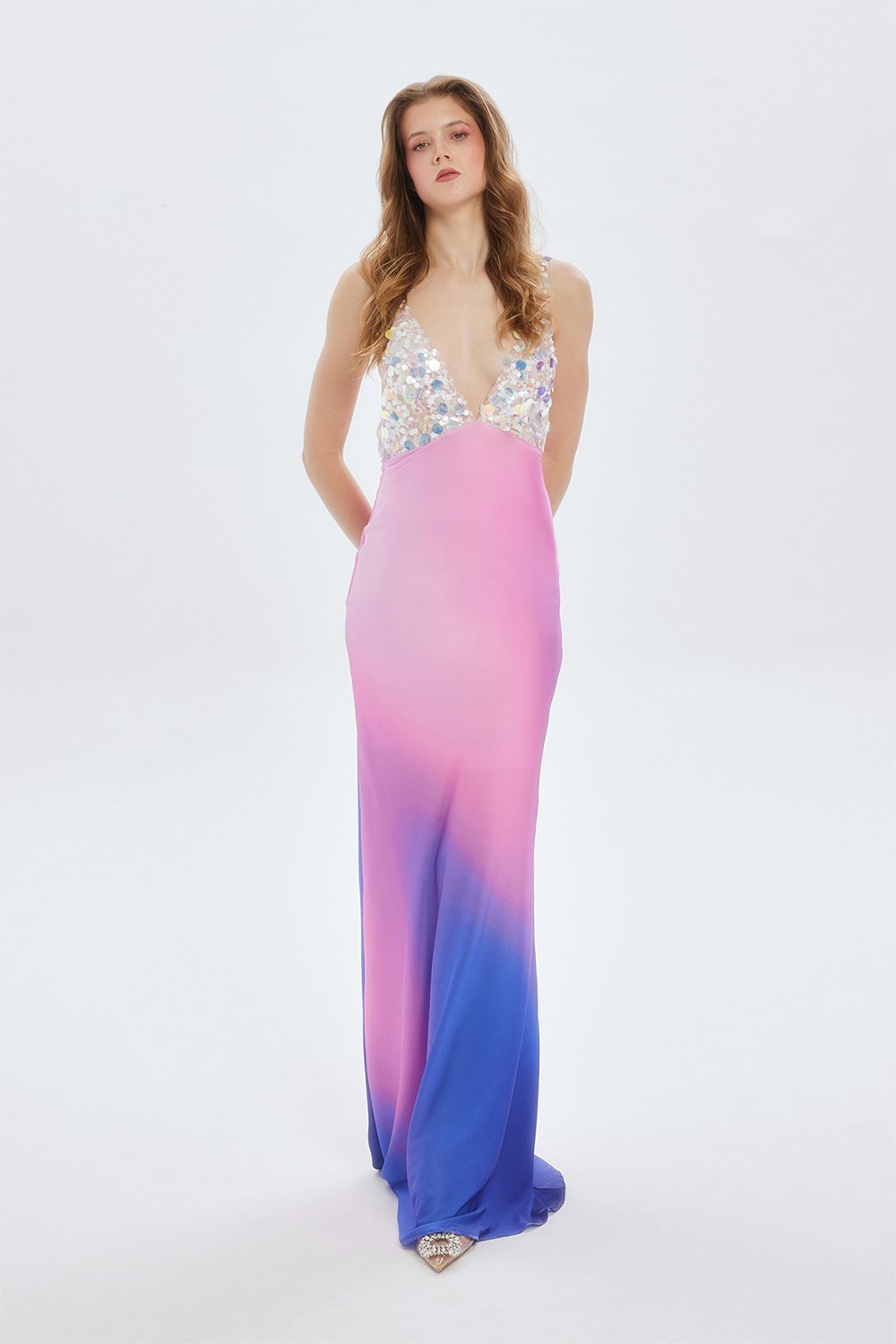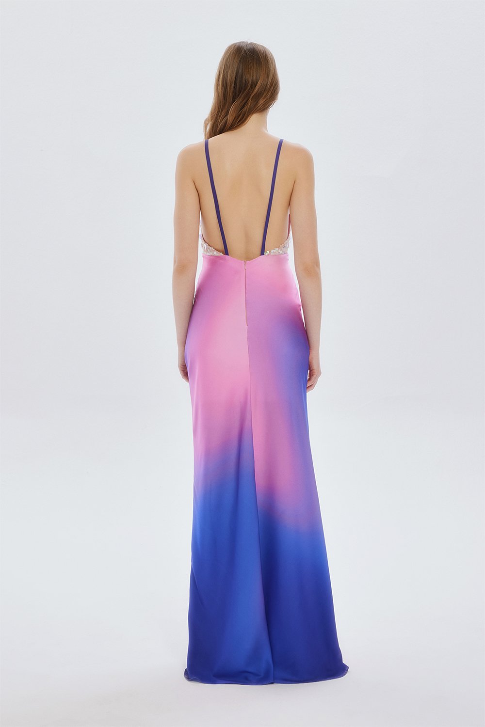 Siren Maxi Saten Yaka Payet Detaylı Degrade Uzun Davet Elbisesi