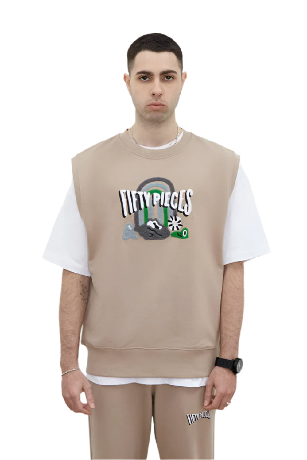 0-yakalı, oversize kesimli, göğüsünde Fifty Pieces yazısı ve manzara illustrasyon havlu kumaş nakışlı, kolsuz süveter. İlkbahar/Yaz sezonuna uygun kumaş ve renkleriyle dolabınızda kesinlikle olması gereken bir model.