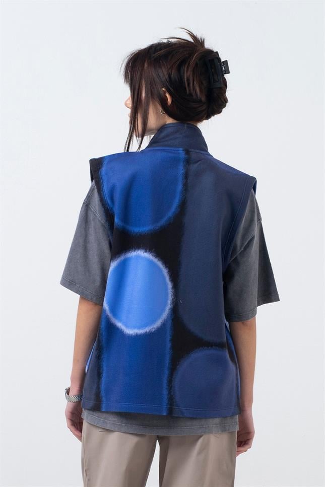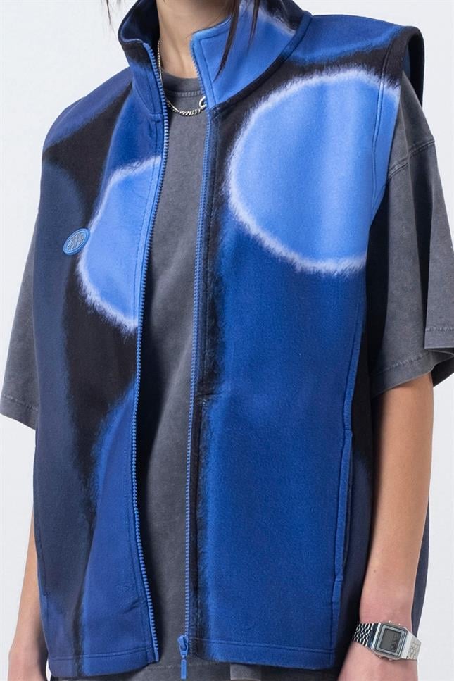 Dik yakalı, cepli, 'fifty' logolu, fermuarlı polar yelek.