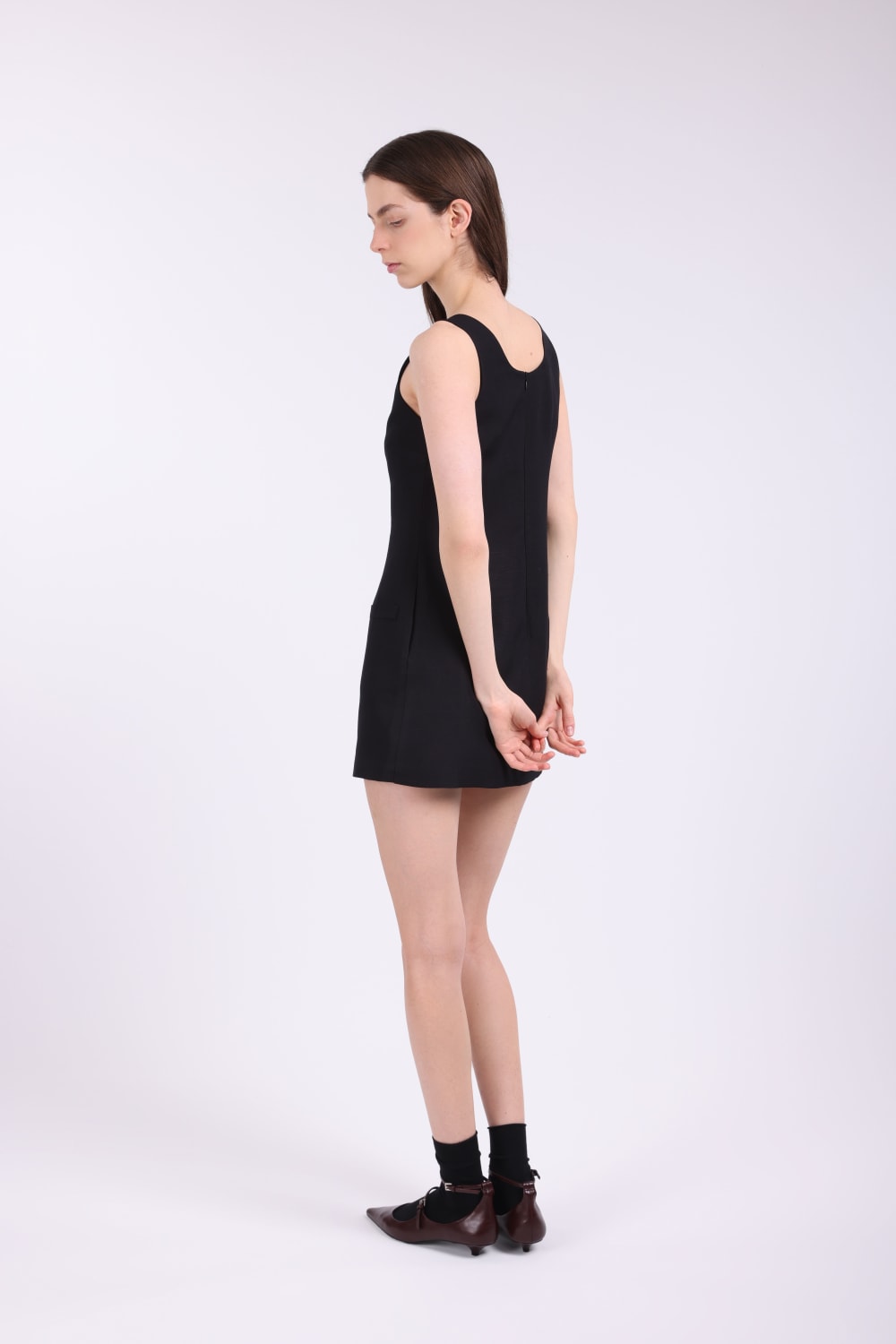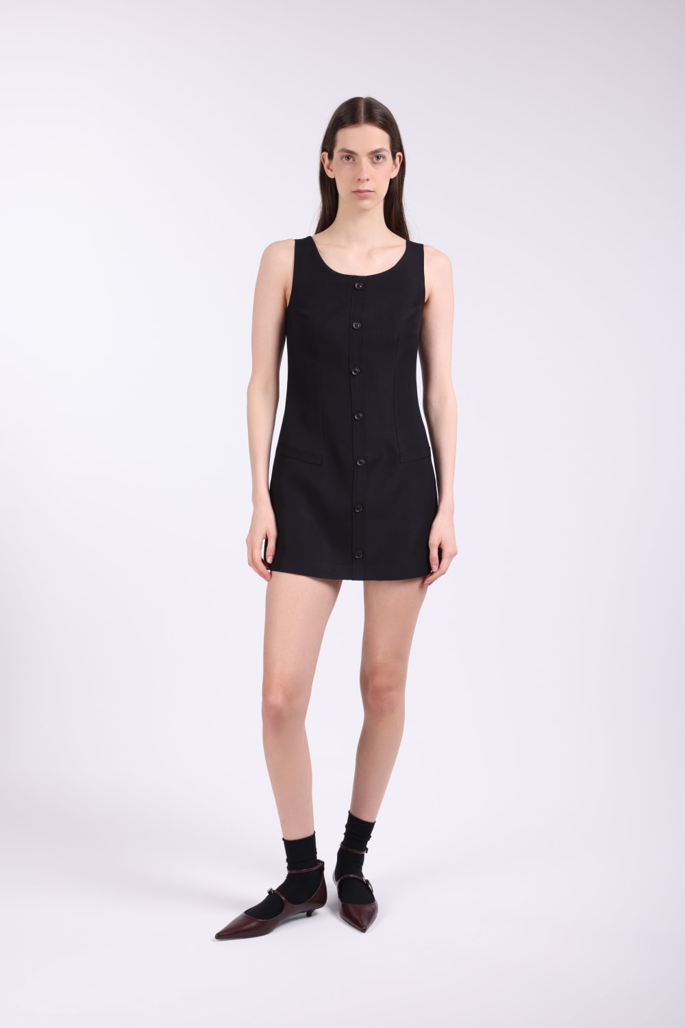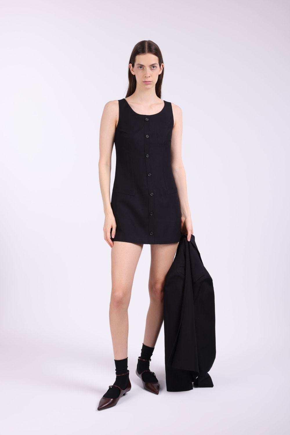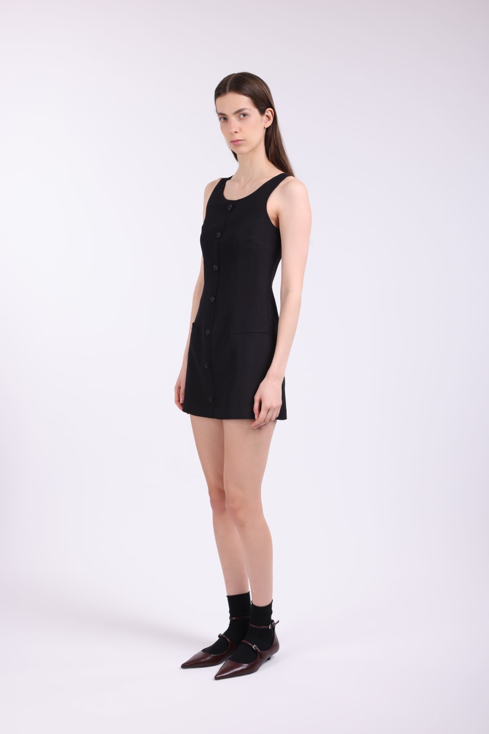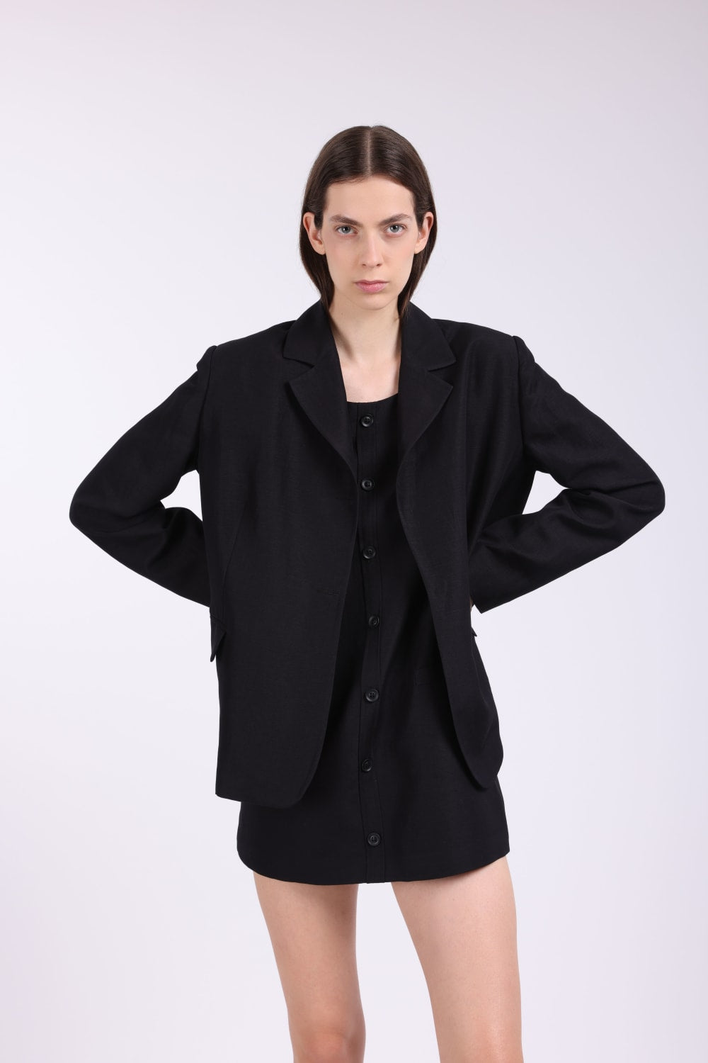 Elbise; Keten karışımlı kumaş, ön düğmeli, sahte pat, yandan gizli cepli, ön cepler işlevsiz, arkadan gizli fermuarlı,iç göstermez, full astarlı. Elbise Boy:82 cm