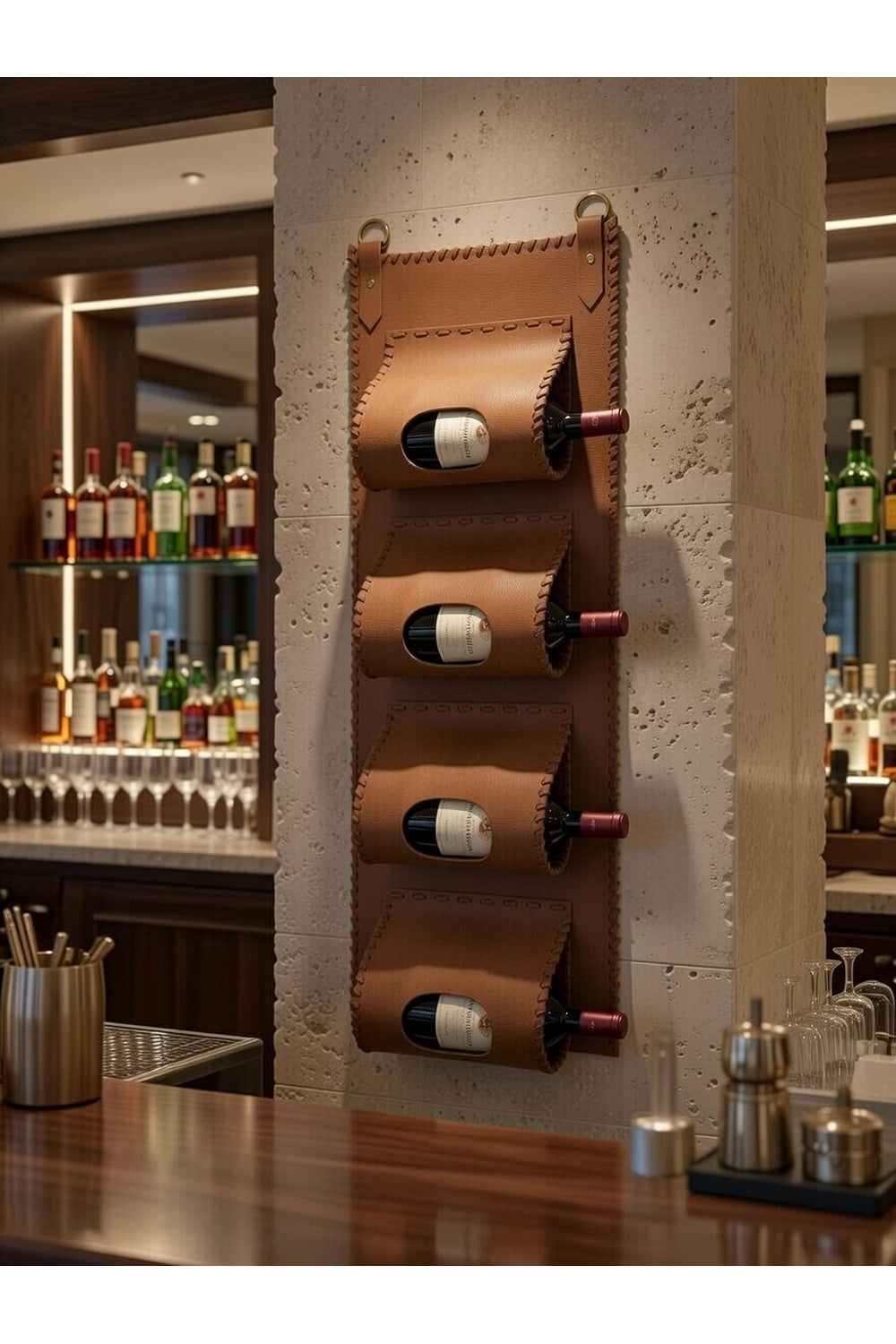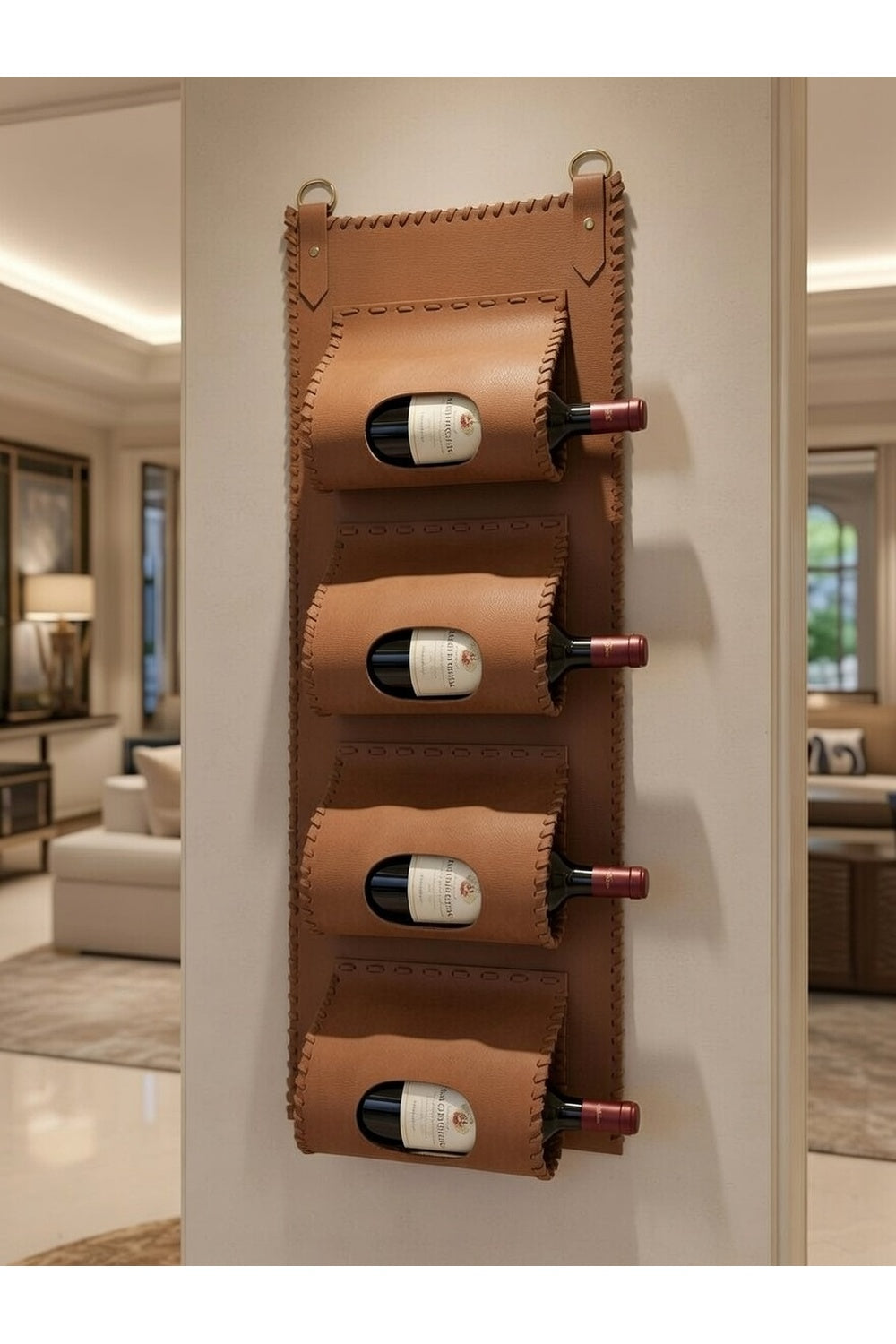 Deri yüzeyde kullanılan el dikişi detaylar ve güçlü askı halkaları, ürüne karakteristik ve sofistike bir görünüm kazandırırken; şarap şişelerini yatay pozisyonda muhafaza ederek ideal saklama koşullarını destekler. Duvara asılan formu sayesinde mekânda yer kaplamaz ve dekoratif bir odak noktası oluşturur.