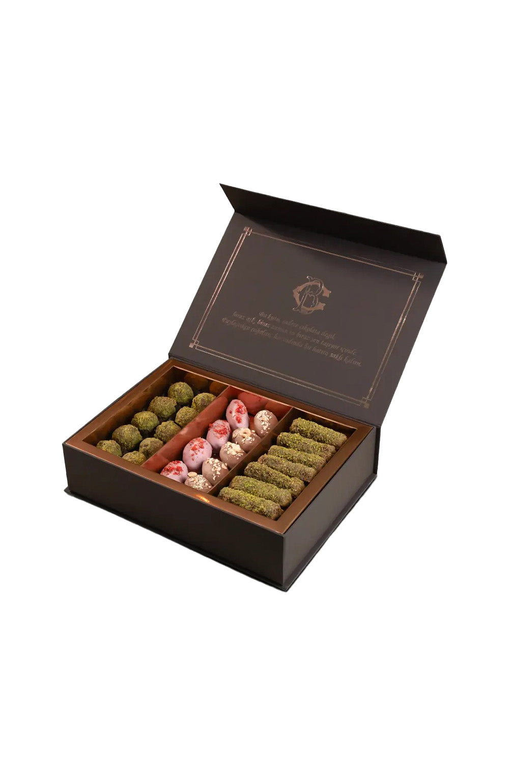 Sütlü ve çilekli çikolataların uyumunu bir arada sunan bu özel kutu, özenle seçilmiş malzemelerle hazırlanarak hem göze hem damağa hitap eder. Misafir ikramlarından özel gün kutlamalarına, kendinize ayıracağınız keyif anlarına kadar her durumda lezzetli bir deneyim sunar.