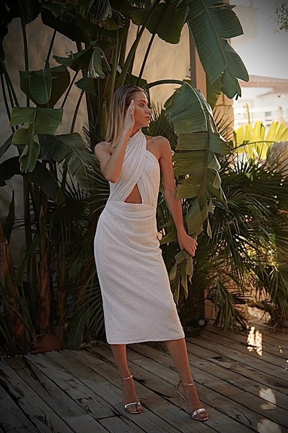 Beyaz Payetli Çapraz Detaylı Midi Elbise