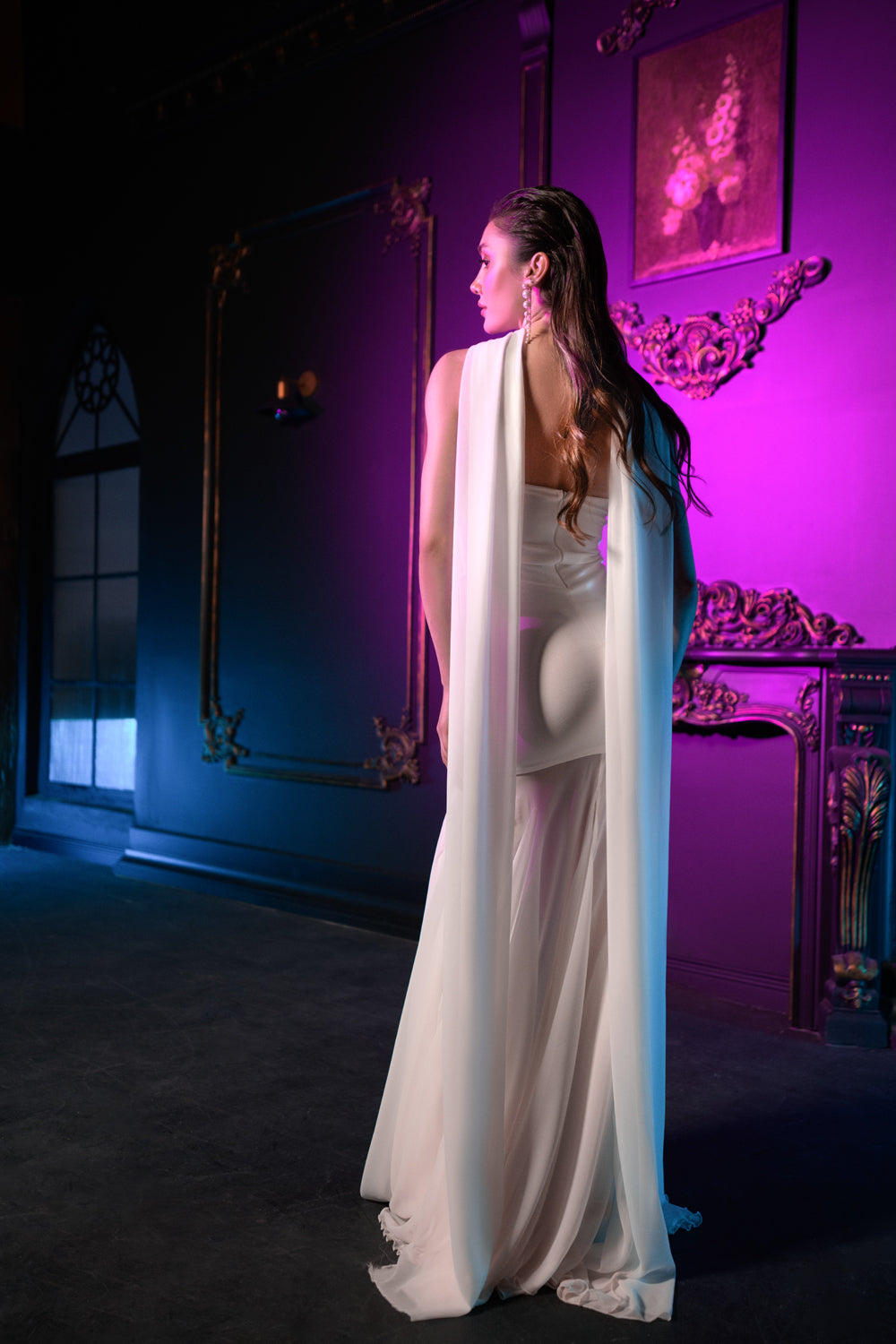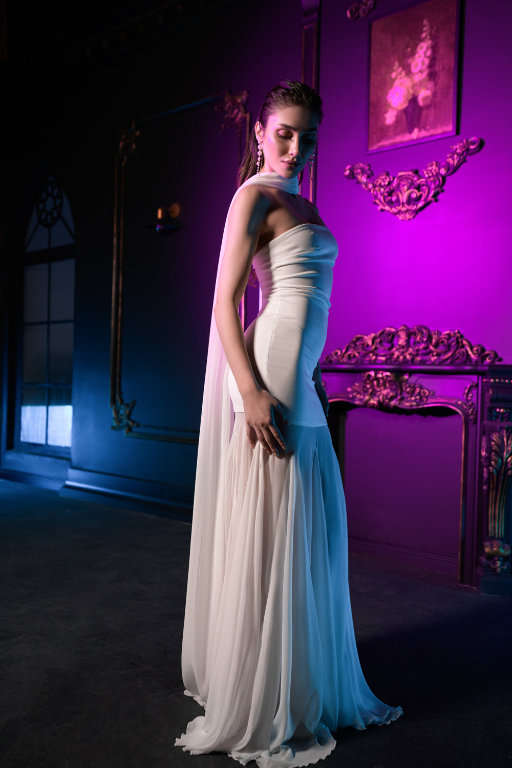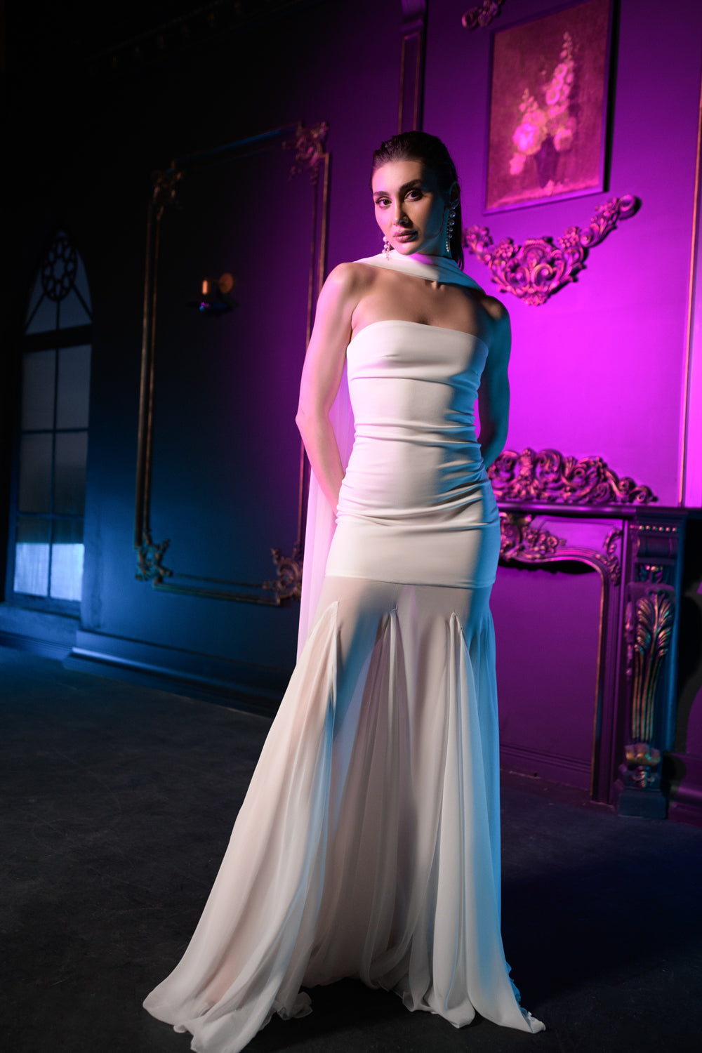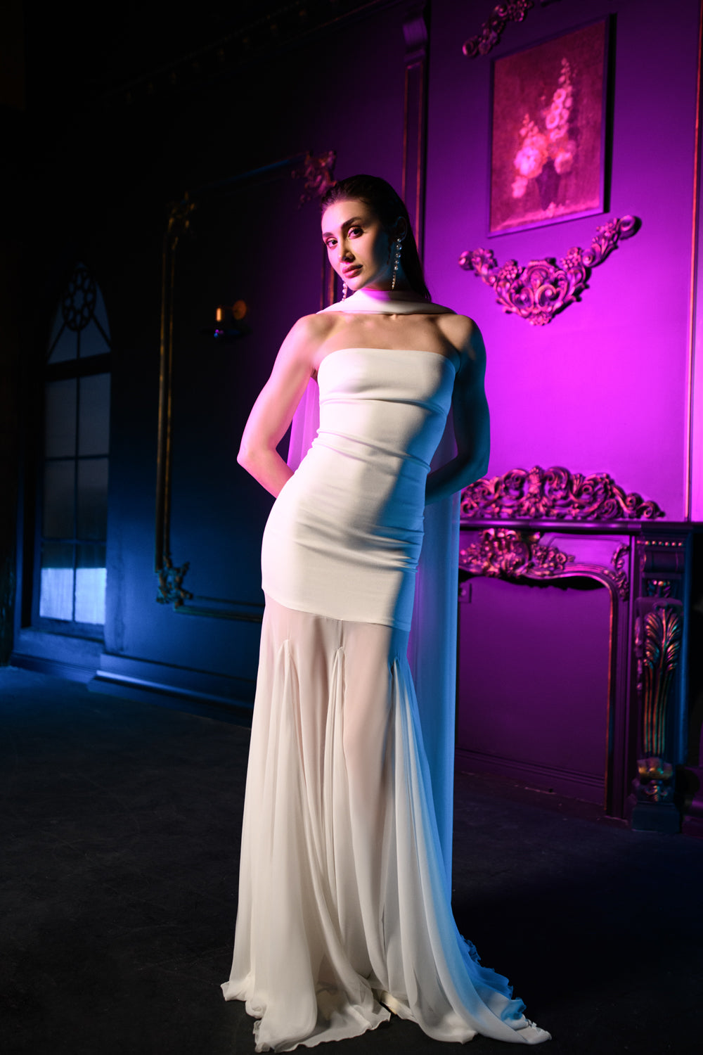 Beyaz Straplez Şifon Etek Detaylı Uzun Elbise