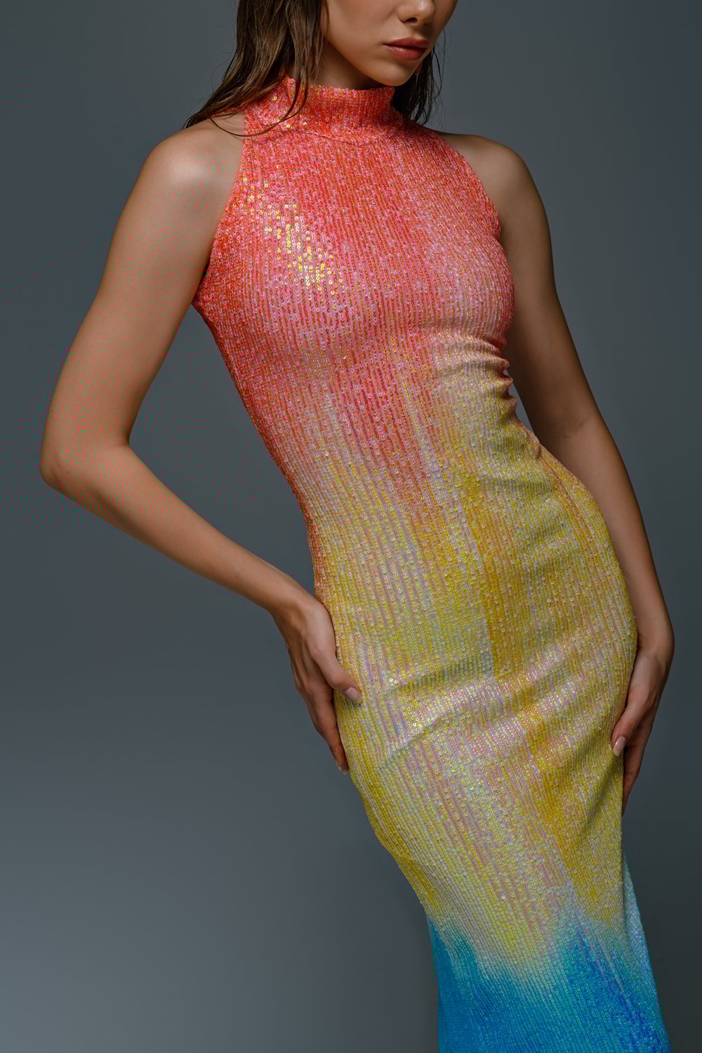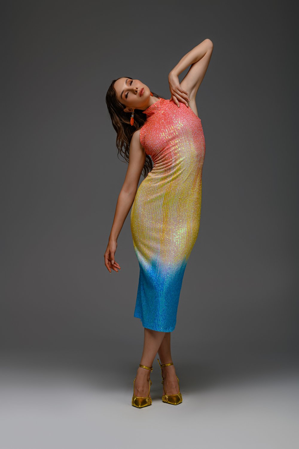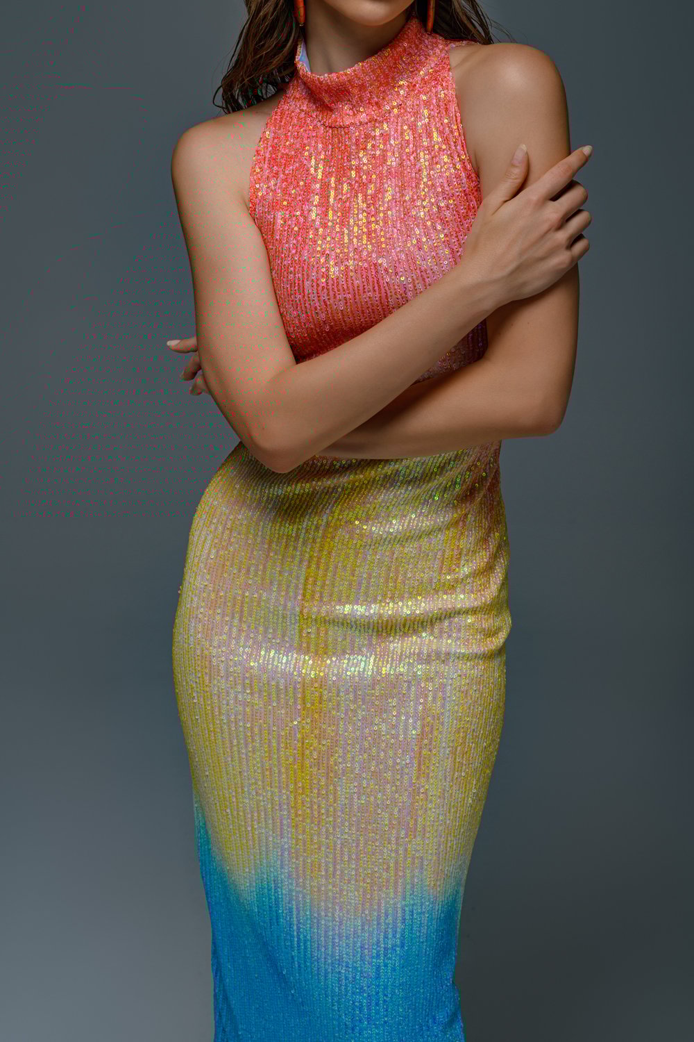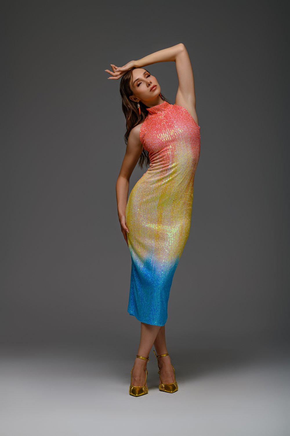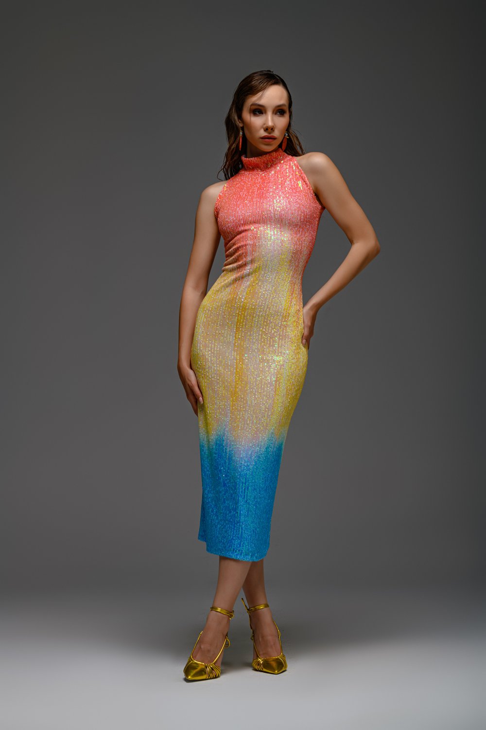 Degrade renk geçişiyle ışığı her açıdan yansıtan bu midi elbise, feminen silueti modern bir yorumla öne çıkarır. Astarlı yapısı iç göstermezken, payet dokusu davet ve özel gecelerde göz alıcı bir ışıltı sağlar. Midi boy kesimi hem zarif hem de akıcı bir duruş sunar.