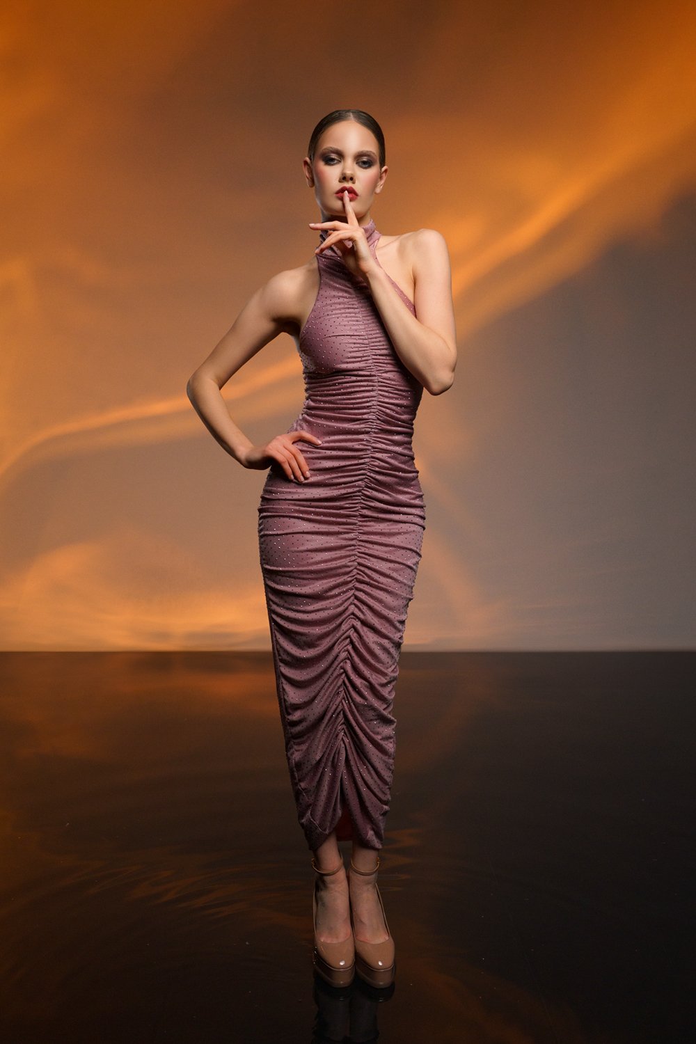 Gül Kurusu Parlak Taşlı Drapeli Elbise