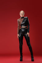 Güçlü ve dikkat çekici bir stil sunan Animal Print Crop Top, PU leather dokusu ve fermuar detayıyla modern ve iddialı bir görünüm yaratır. Likralı yapısı sayesinde vücudu kavrayan fit silueti, feminen hatları öne çıkarır. Tek başına statement bir parça olduğu gibi ceket, mini etek veya yüksek bel pantolonlarla kombinlendiğinde şehir stilini kolayca tamamlar.
