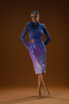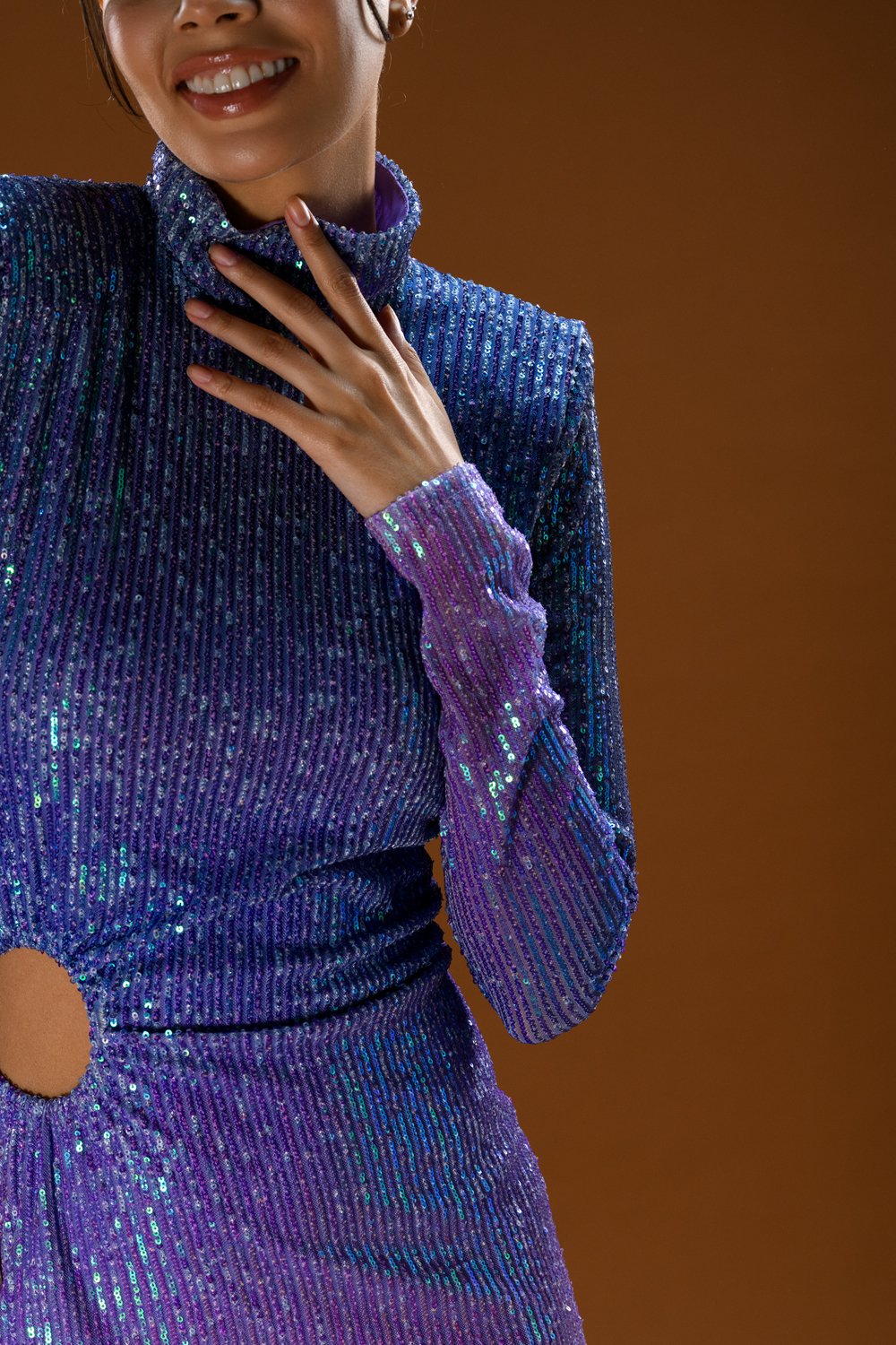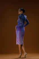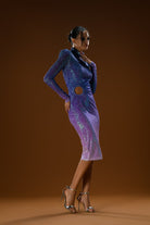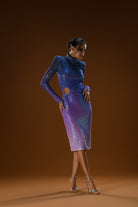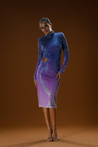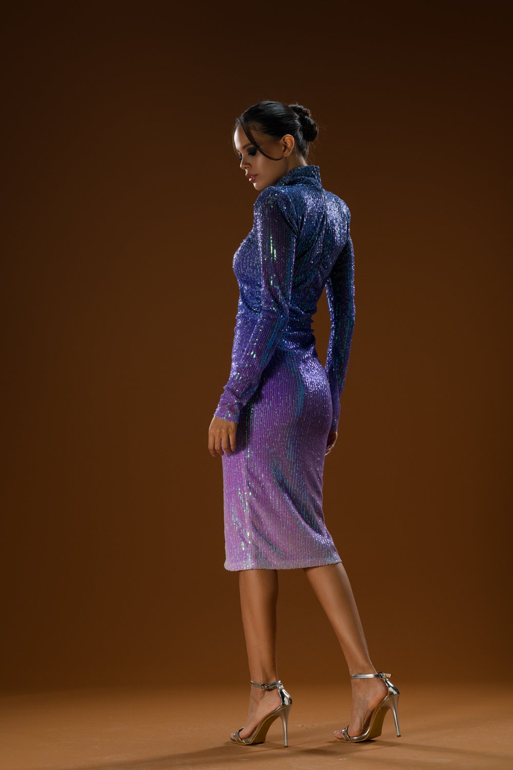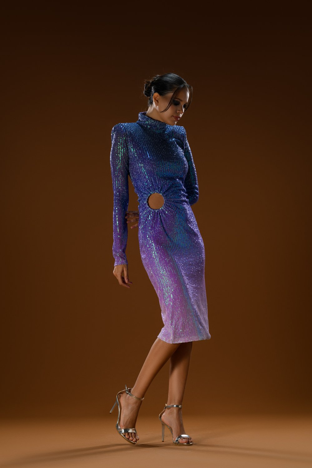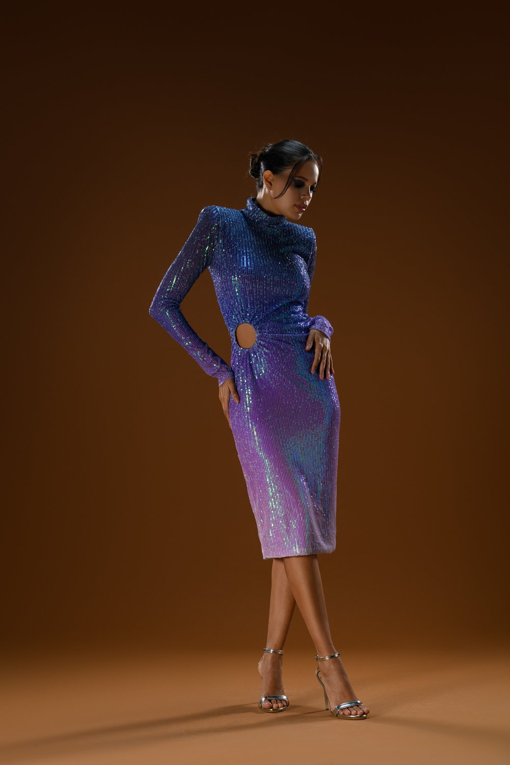 Lacivert ve morun degrade geçişiyle göz alıcı bir ışıltı sunan bu midi elbise, halka detayıyla modern ve feminen bir vurgu yaratır. Likralı yapısı vücudu zarifçe sararken, astarlı formu iç göstermeden kusursuz bir siluet sağlar. Özel geceler, davetler ve kokteyl stilleri için iddialı bir seçimdir.