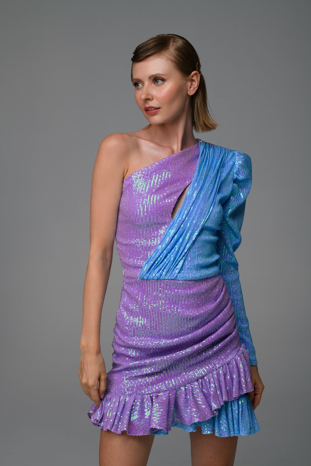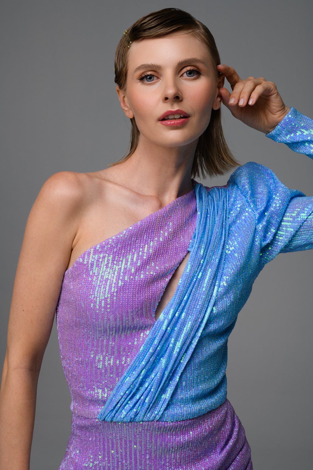 Lila ve mavinin ışıltılı degrade geçişiyle öne çıkan bu tek omuz mini elbise, modern ve çekici bir siluet sunar. Likralı yapısı bedeni zarifçe sararken, astarlı formu iç göstermez ve konforlu bir kullanım sağlar. Tek omuz detayıyla feminen görünüme güçlü bir vurgu katarken, özel geceler ve davetlerde dikkatleri üzerine çeken bir şıklık yaratır.